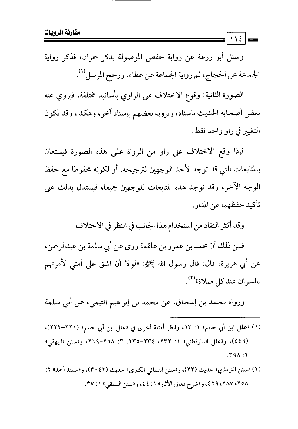(¬١) «علل ابن أبي حاتم» ١: ٦٣, وانظر أمثلة أخرى في «علل ابن أبي حاتم» (٢٢١ - ٢٢٢) , (٥٤٩) , و «علل الدارقطني» ١: ٢٣٢, ٢٣٤ - ٢٣٥, ٣: ٢٦٨ - ٢٦٩, و «سنن البيهقي» ٢: ٣٩٨.