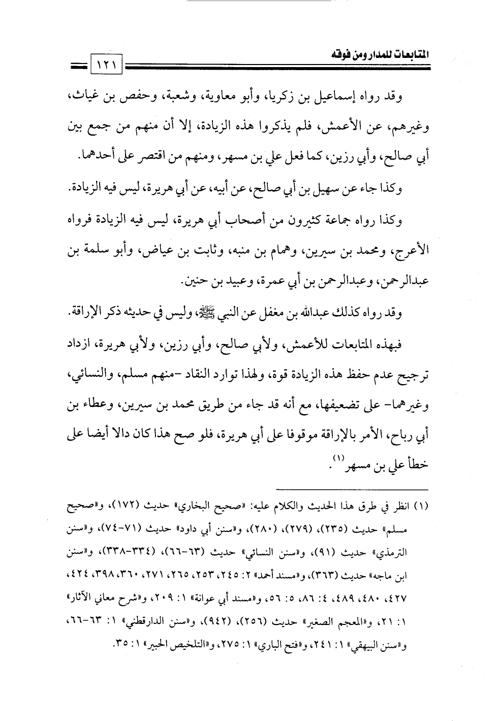 فبهذه المتابعات للأعمش, ولأبي صالح, وأبي رزين, ولأبي هريرة, ازداد ترجيح عدم حفظ هذه الزيادة قوة, ولهذا توارد النقاد -منهم مسلم, والنسائي, وغيرهما- على تضعيفها, مع أنه قد جاء من طريق محمد بن سيرين, وعطاء بن أبي رباح, الأمر بالإراقة موقوفا على أبي هريرة, فلو صح هذا كان دالا أيضا على خطأ علي بن مسهر (¬١).