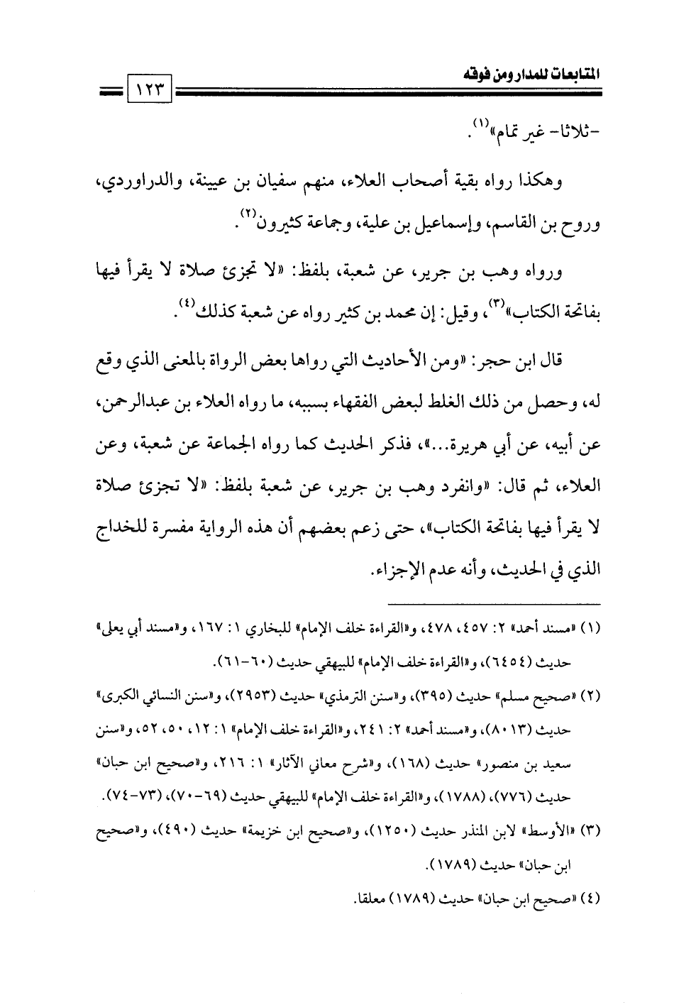 ورواه وهب بن جرير، عن شعبة، بلفظ: «لا تجزئ صلاة لا يقرأ فيها بفاتحة الكتاب» (¬٣)، وقيل: إن محمد بن كثير رواه عن شعبة كذلك (¬٤).