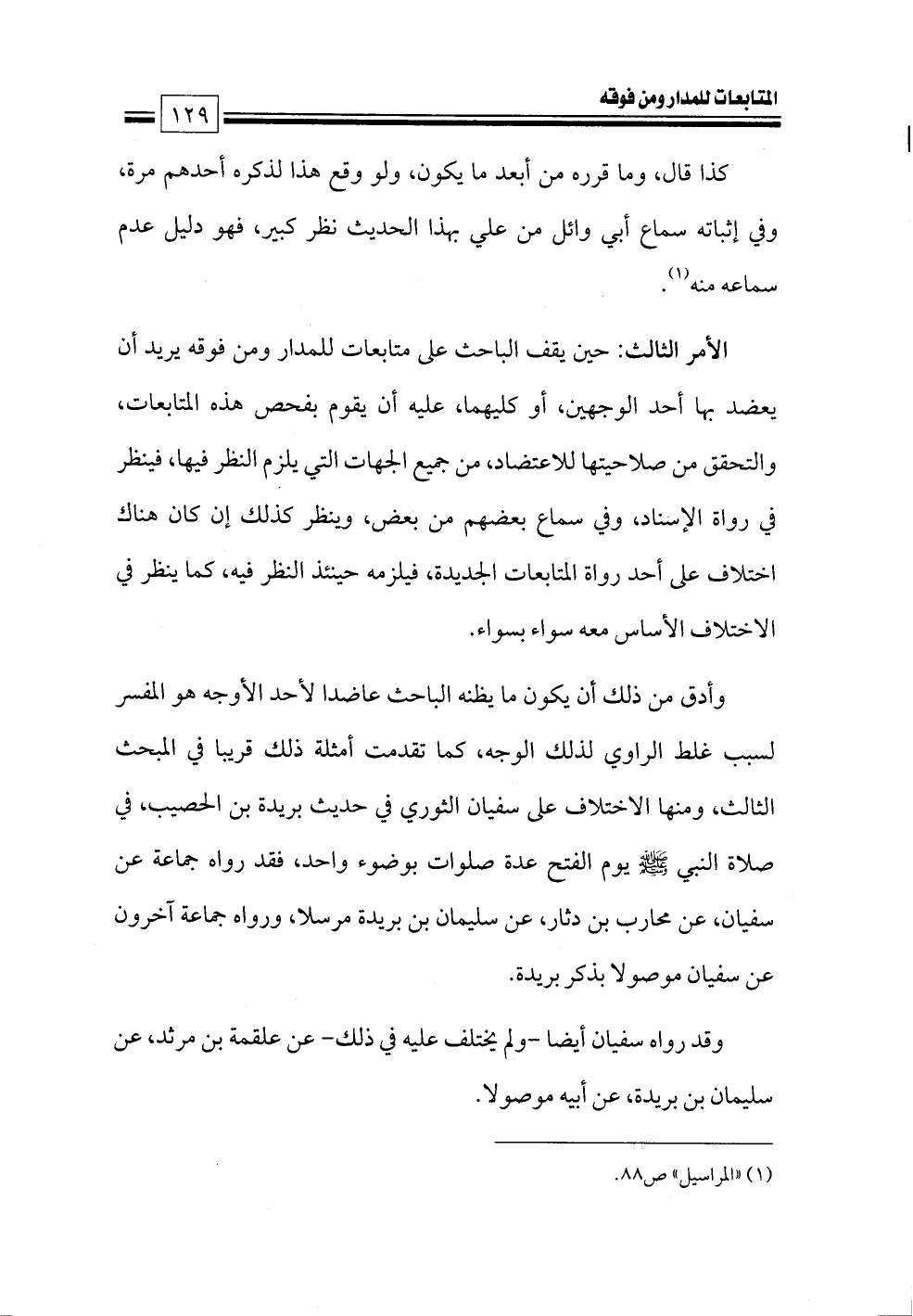 الأمر الثالث: حين يقف الباحث على متابعات للمدار ومن فوقه يريد أن يعضد بها أحد الوجهين, أو كليهما, عليه أن يقوم بفحص هذه المتابعات, والتحقق من صلاحيتها للاعتضاد، من جميع الجهات التي يلزم النظر فيها, فينظر في رواة الإسناد, وفي سماع بعضهم من بعض, وينظر كذلك إن كان هناك اختلاف على أحد رواة المتابعات الجديدة, فيلزمه حينئذ النظر فيه, كما ينظر في الاختلاف الأساس معه سواء بسواء.