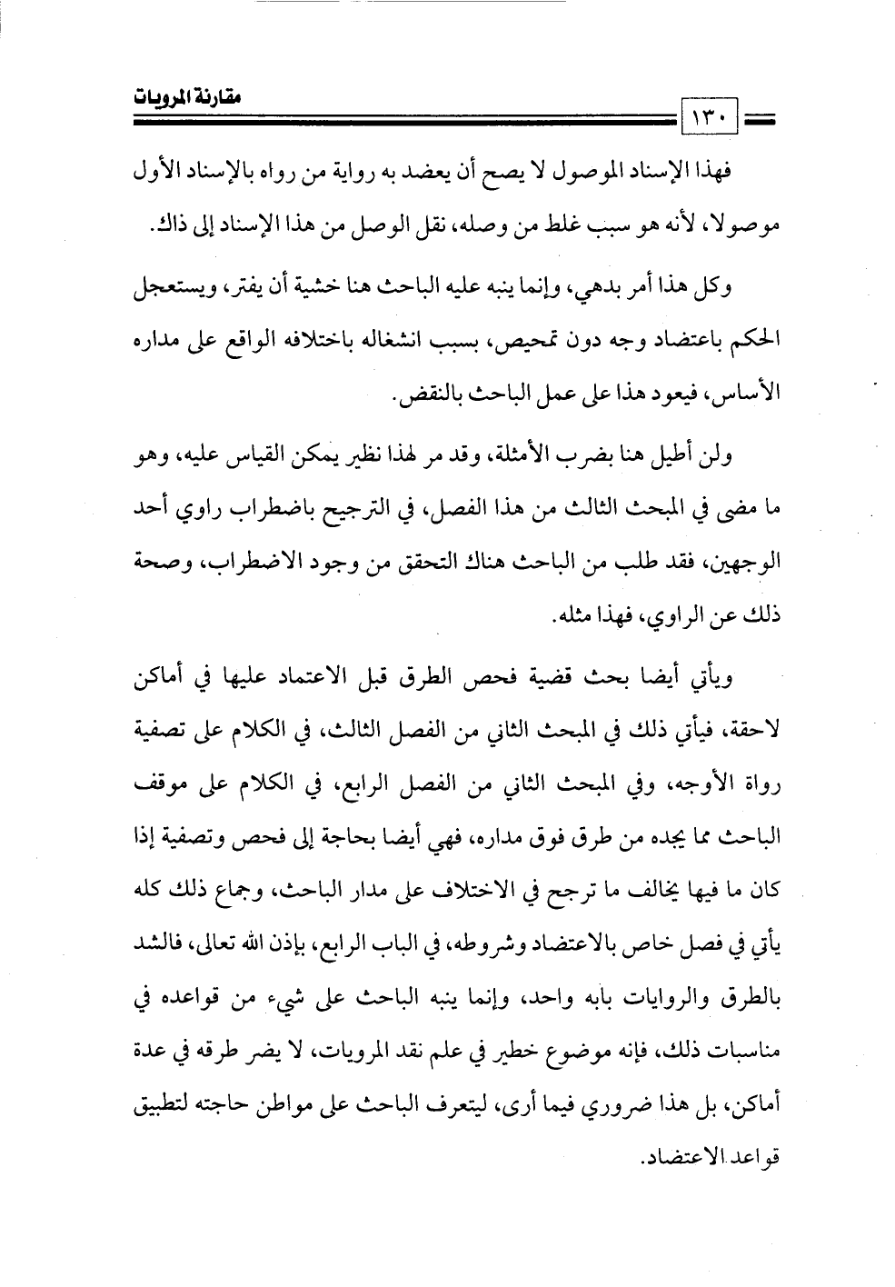 ويأتي أيضا بحث قضية فحص الطرق قبل الاعتماد عليها في أماكن لاحقة, فيأتي ذلك في المبحث الثاني من الفصل الثالث, في الكلام على تصفية رواة الأوجه, وفي المبحث الثاني من الفصل الرابع, في الكلام على موقف الباحث مما يجده من طرق فوق مداره, فهي أيضا بحاجة إلى فحص وتصفية إذا كان ما فيها يخالف ما ترجح في الاختلاف على مدار الباحث, وجماع ذلك كله يأتي في فصل خاص بالاعتضاد وشروطه, في الباب الرابع، بإذن الله تعالى, فالشد بالطرق والروايات بابه واحد, وإنما ينبه الباحث على شيء من قواعده في مناسبات ذلك, فإنه موضوع خطير في علم نقد المرويات, لا يضر طرقه في عدة أماكن, بل هذا ضروري فيما أرى, ليتعرف الباحث على مواطن حاجته لتطبيق قواعد الاعتضاد.