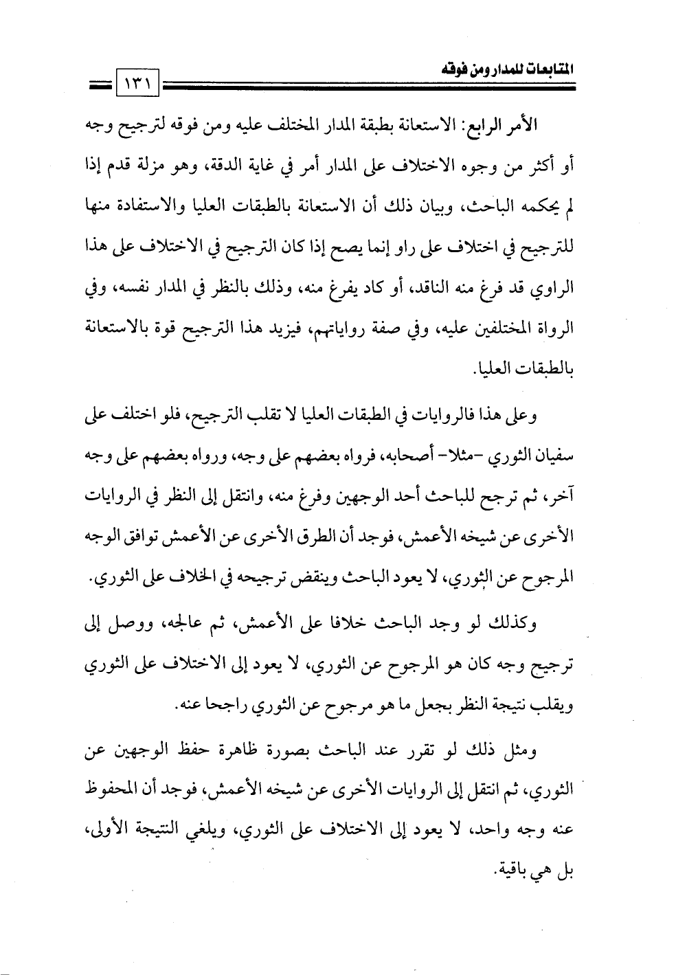 الأمر الرابع: الاستعانة بطبقة المدار المختلف عليه ومن فوقه لترجيح وجه أو أكثر من وجوه الاختلاف على المدار أمر في غاية الدقة, وهو مزلة قدم إذا لم يحكمه الباحث، وبيان ذلك أن الاستعانة بالطبقات العليا والاستفادة منها للترجيح في اختلاف على راو إنما يصح إذا كان الترجيح في الاختلاف على هذا الراوي قد فرغ منه الناقد, أو كاد يفرغ منه, وذلك بالنظر في المدار نفسه, وفي الرواة المختلفين عليه, وفي صفة رواياتهم, فيزيد هذا الترجيح قوة بالاستعانة بالطبقات العليا.