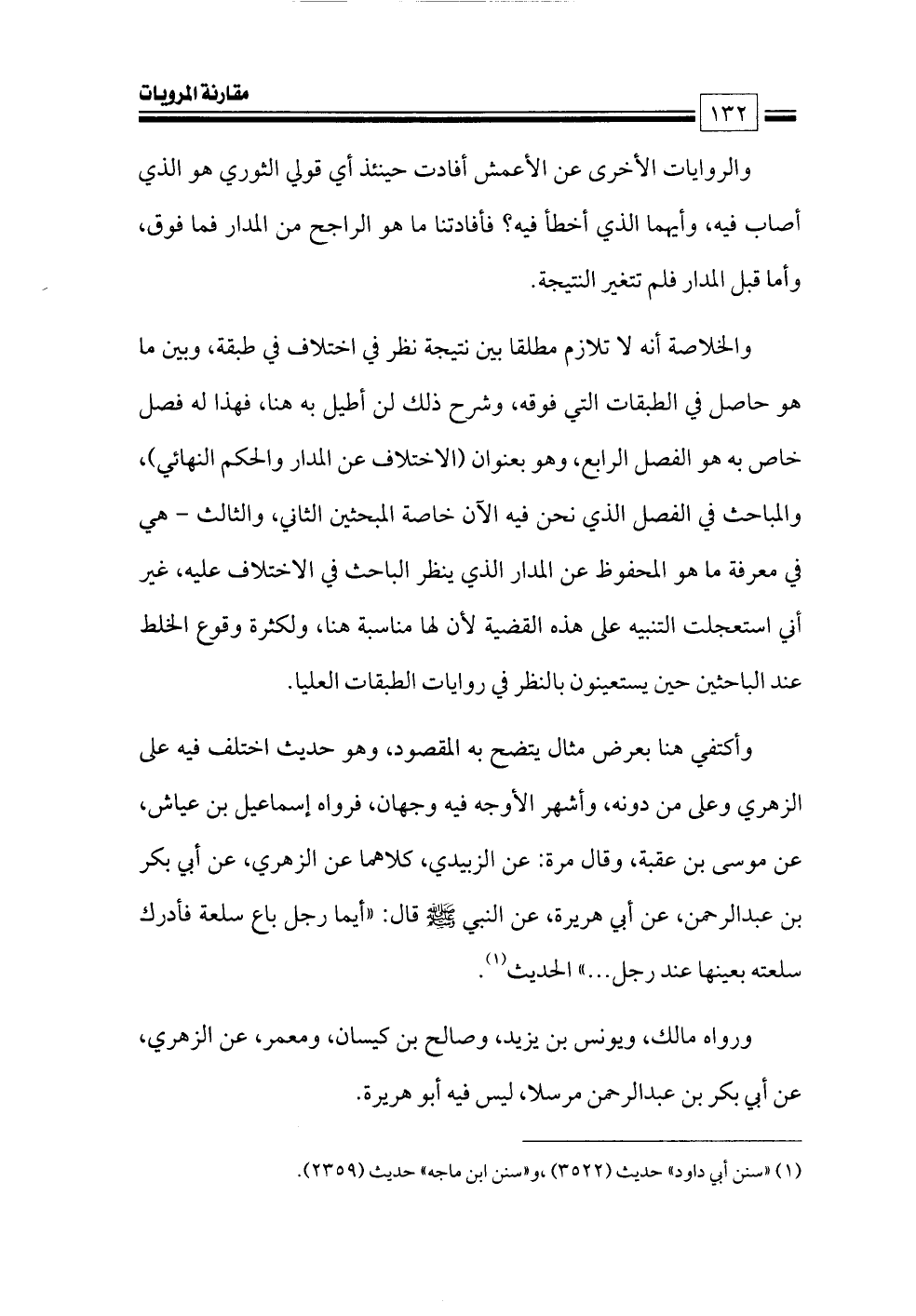 والخلاصة أنه لا تلازم مطلقا بين نتيجة نظر في اختلاف في طبقة، وبين ما هو حاصل في الطبقات التي فوقه, وشرح ذلك لن أطيل به هنا, فهذا له فصل خاص به هو الفصل الرابع, وهو بعنوان (الاختلاف عن المدار والحكم النهائي) , والمباحث في الفصل الذي نحن فيه الآن خاصة المبحثين الثاني, والثالث - هي في معرفة ما هو المحفوظ عن المدار الذي ينظر الباحث في الاختلاف عليه, غير أني استعجلت التنبيه على هذه القضية لأن لها مناسبة هنا، ولكثرة وقوع الخلط عند الباحثين حين يستعينون بالنظر في روايات الطبقات العليا.