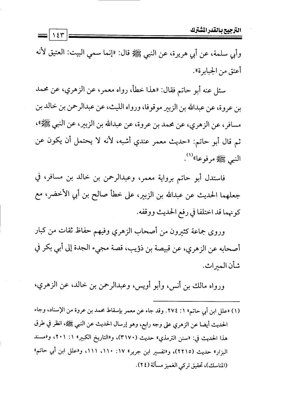 (¬١) «علل ابن أبي حاتم» ١: ٢٧٤. وقد جاء عن معمر بإسقاط محمد بن عروة من الإسناد، وجاء الحديث أيضا عن الزهري على وجه رابع، وهو إرسال الحديث عن النبي - صلى الله عليه وسلم -، انظر في طرق هذا الحديث في: «سنن الترمذي» حديث (٣١٧٠)، و «التاريخ الكبير» ١: ٢٠١، و «مسند البزار» حديث (٢٢١٥)، و «تفسير ابن جرير» ١٧: ١١٠، ١١١، و «علل ابن أبي حاتم» (المناسك)، تحقيق تركي الغميز مسألة (٢٤).