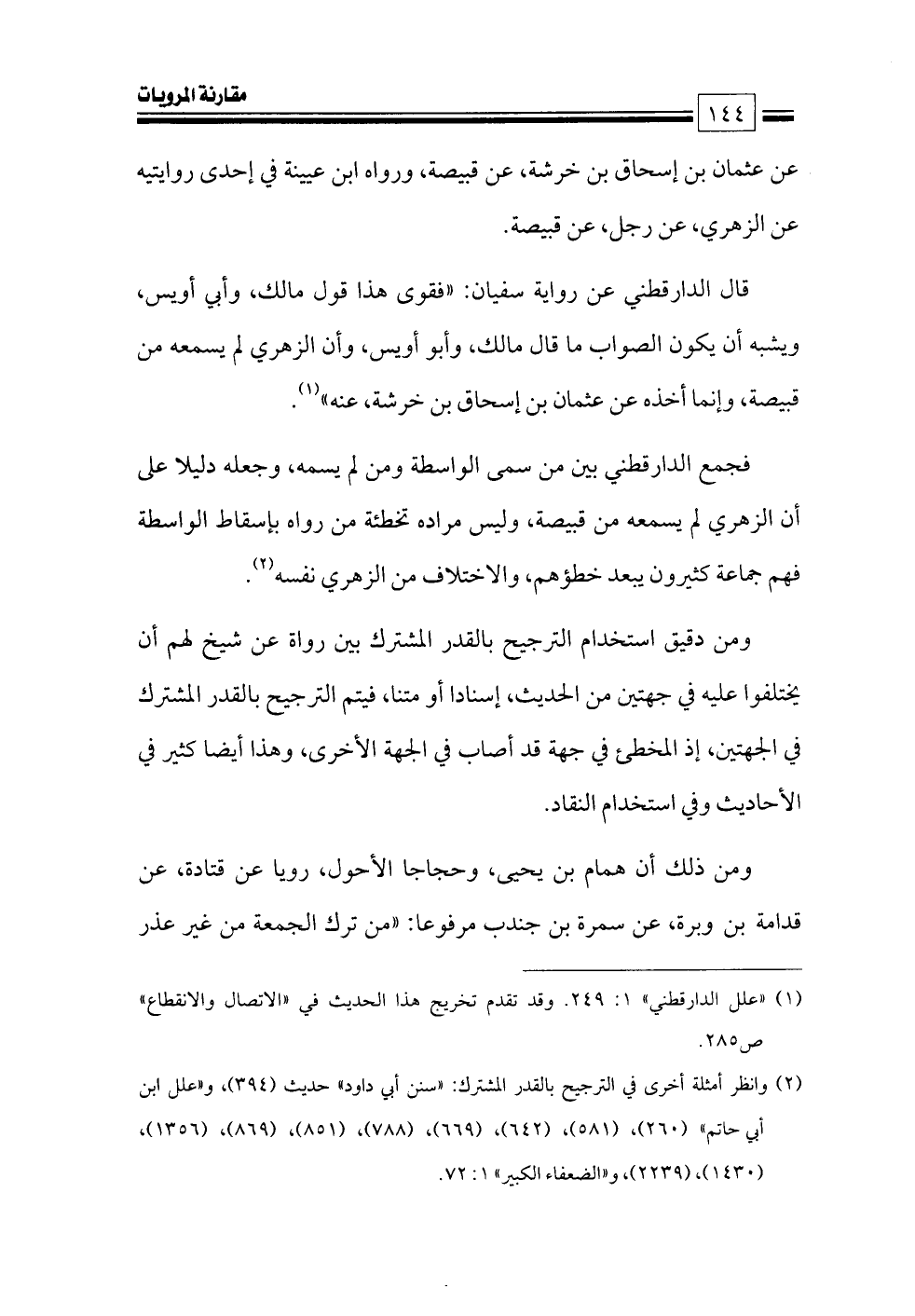 (¬٢) وانظر أمثلة أخرى في الترجيح بالقدر المشترك: «سنن أبي داود» حديث (٣٩٤) , و «علل ابن أبي حاتم» (٢٦٠) , (٥٨١)، (٦٤٢) , (٦٦٩)، (٧٨٨)، (٨٥١)، (٨٦٩)، (١٣٥٦)، (١٤٣٠)، (٢٢٣٩)، و «الضعفاء الكبير» ١: ٧٢.