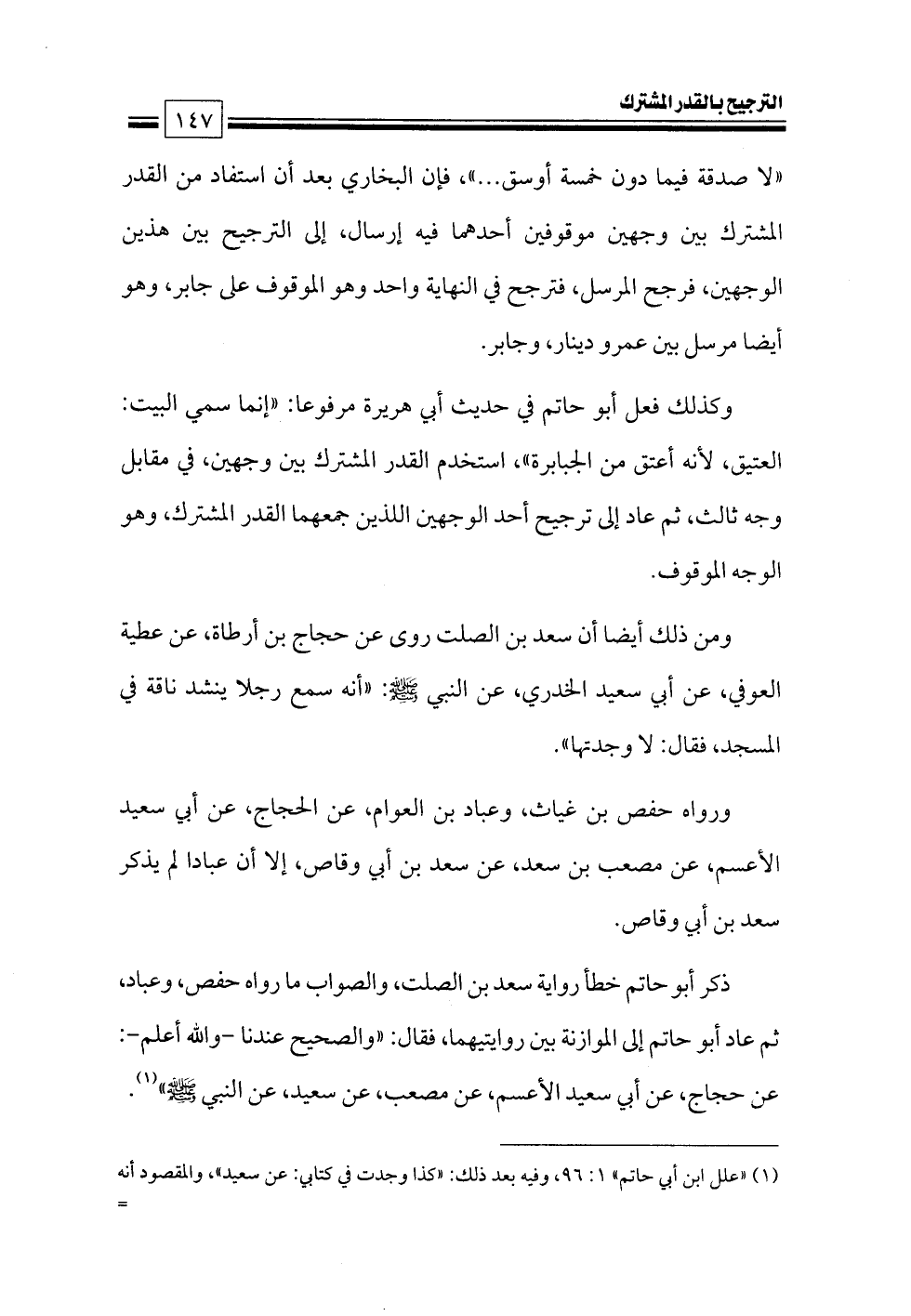 وكذلك فعل أبو حاتم في حديث أبي هريرة مرفوعا: «إنما سمي البيت: العتيق، لأنه أعتق من الجبابرة»، استخدم القدر المشترك بين وجهين، في مقابل وجه ثالث، ثم عاد إلى ترجيح أحد الوجهين اللذين جمعهما القدر المشترك، وهو الوجه الموقوف.