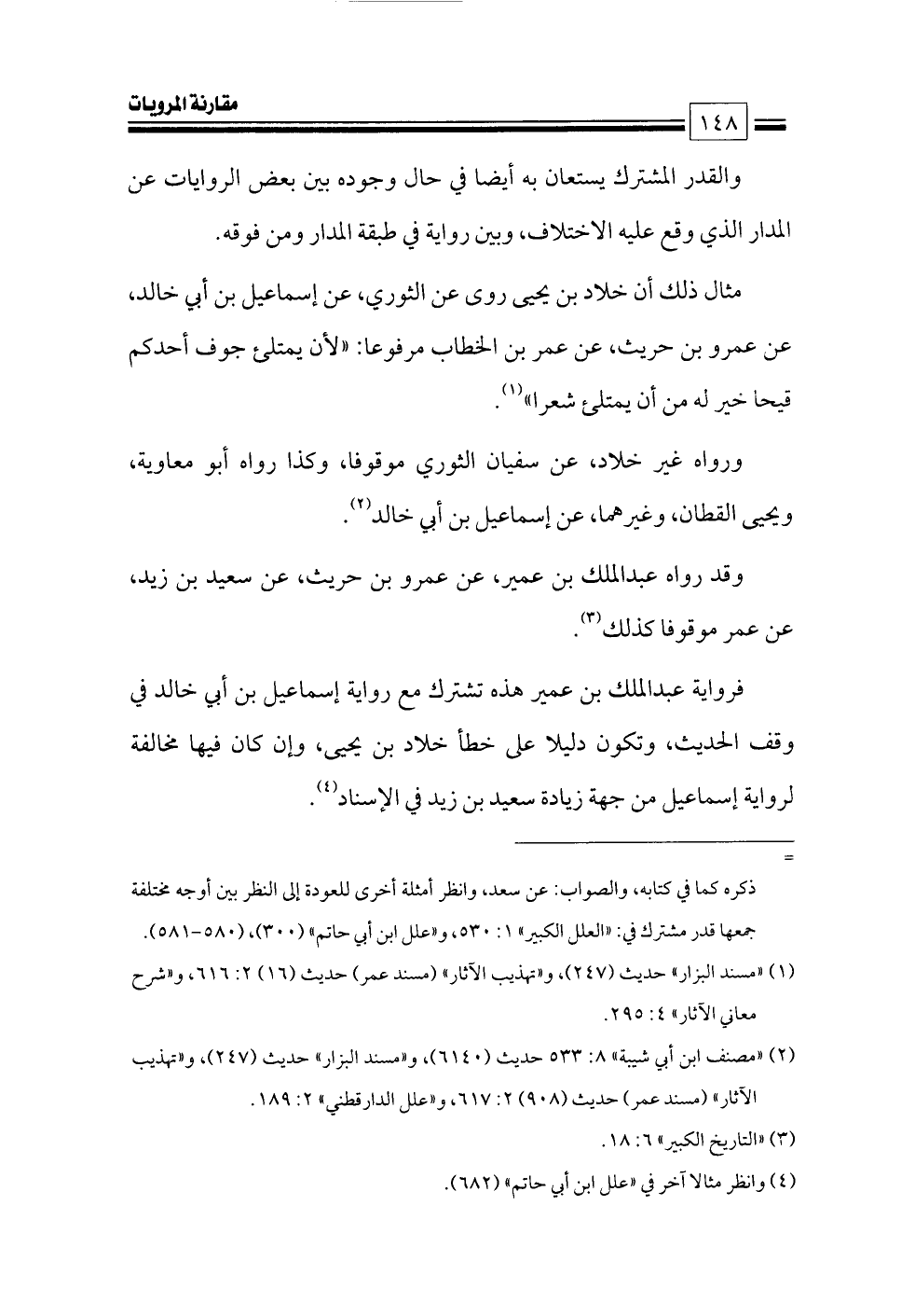 فرواية عبدالملك بن عمير هذه تشترك مع رواية إسماعيل بن أبي خالد في وقف الحديث, وتكون دليلا على خطأ خلاد بن يحيى, وإن كان فيها مخالفة لرواية إسماعيل من جهة زيادة سعيد بن زيد في الإسناد (¬٤).