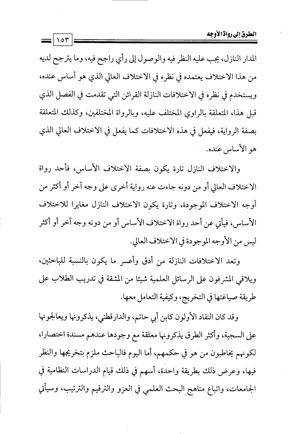 المدار النازل، يجب عليه النظر فيه والوصول إلى رأي راجح فيه، وما يترجح لديه من هذا الاختلاف يعتمده في نظره في الاختلاف العالي الذي هو أساس عنده، ويستخدم في نظره في الاختلافات النازلة القرائن التي تقدمت في الفصل الذي قبل هذا, المتعلقة بالراوي المختلف عليه، وبالرواة المختلفين، وكذلك المتعلقة بصفة الرواية، فيفعل في هذه الاختلافات كما يفعل في الاختلاف العالي الذي هو الأساس عنده.