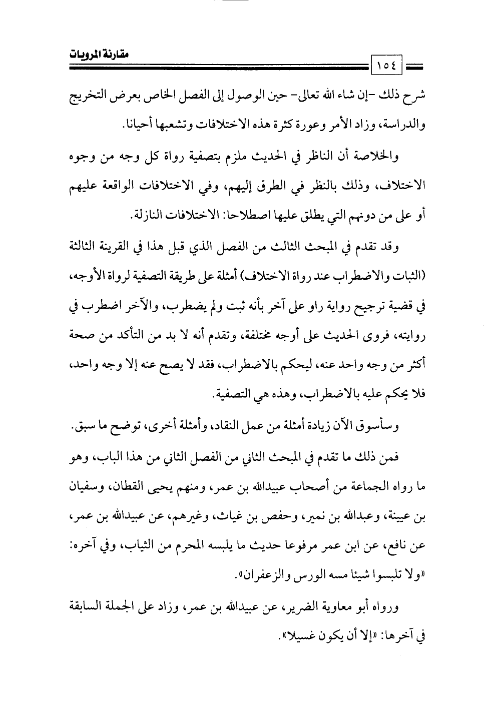 فمن ذلك ما تقدم في المبحث الثاني من الفصل الثاني من هذا الباب, وهو ما رواه الجماعة من أصحاب عبيدالله بن عمر، ومنهم يحيى القطان، وسفيان بن عيينة، وعبدالله بن نمير، وحفص بن غياث، وغيرهم، عن عبيدالله بن عمر، عن نافع، عن ابن عمر مرفوعا حديث ما يلبسه المحرم من الثياب، وفي آخره: «ولا تلبسوا شيئا مسه الورس والزعفران».