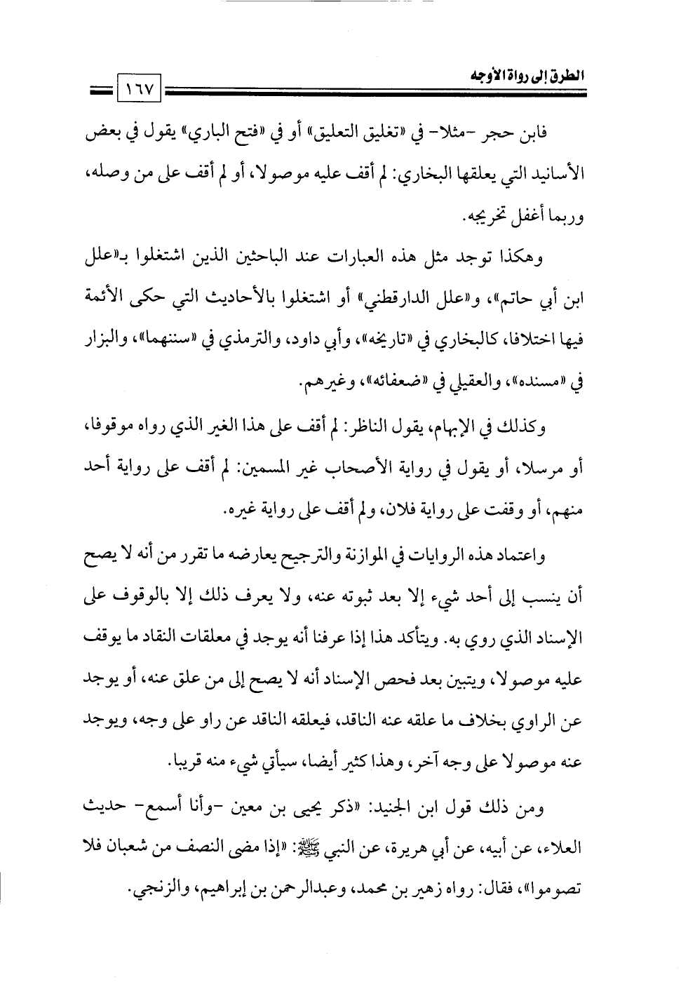 ومن ذلك قول ابن الجنيد: «ذكر يحيى بن معين -وأنا أسمع- حديث العلاء, عن أبيه, عن أبي هريرة، عن النبي - صلى الله عليه وسلم -: «إذا مضى النصف من شعبان فلا تصوموا»، فقال: رواه زهير بن محمد, وعبدالرحمن بن إبراهيم, والزنجي.