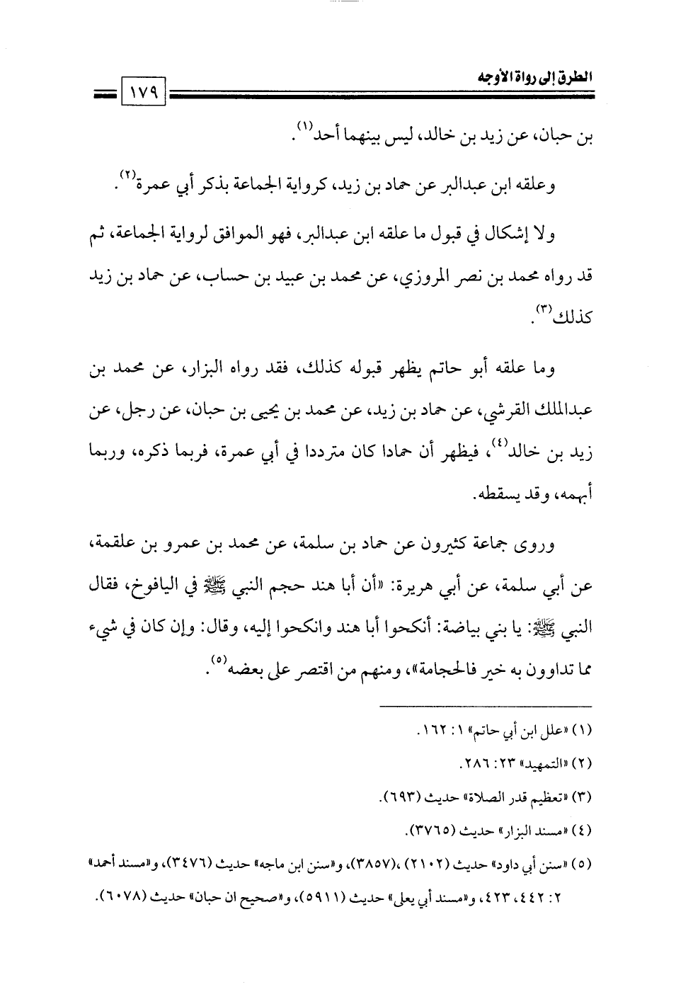 وما علقه أبو حاتم يظهر قبوله كذلك, فقد رواه البزار, عن محمد بن عبدالملك القرشي, عن حماد بن زيد, عن محمد بن يحيى بن حبان, عن رجل, عن زيد بن خالد (¬٤) , فيظهر أن حمادا كان مترددا في أبي عمرة, فربما ذكره, وربما أبهمه, وقد يسقطه.