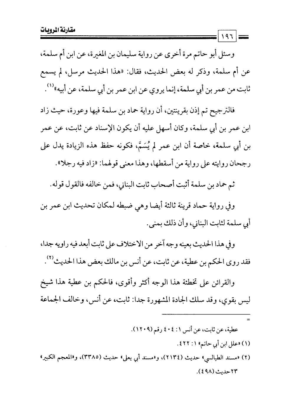 فالترجيح تم إذن بقرينتين، أن رواية حماد بن سلمة فيها وعورة، حيث زاد ابن عمر بن أبي سلمة، وكان أسهل عليه أن يكون الإسناد عن ثابت، عن عمر بن أبي سلمة، خاصة أن ابن عمر لم يُسَمَّ، فكونه حفظ هذه الزيادة يدل على رجحان روايته على رواية من أسقطها، وهذا معنى قولهما: «زاد فيه رجلا».