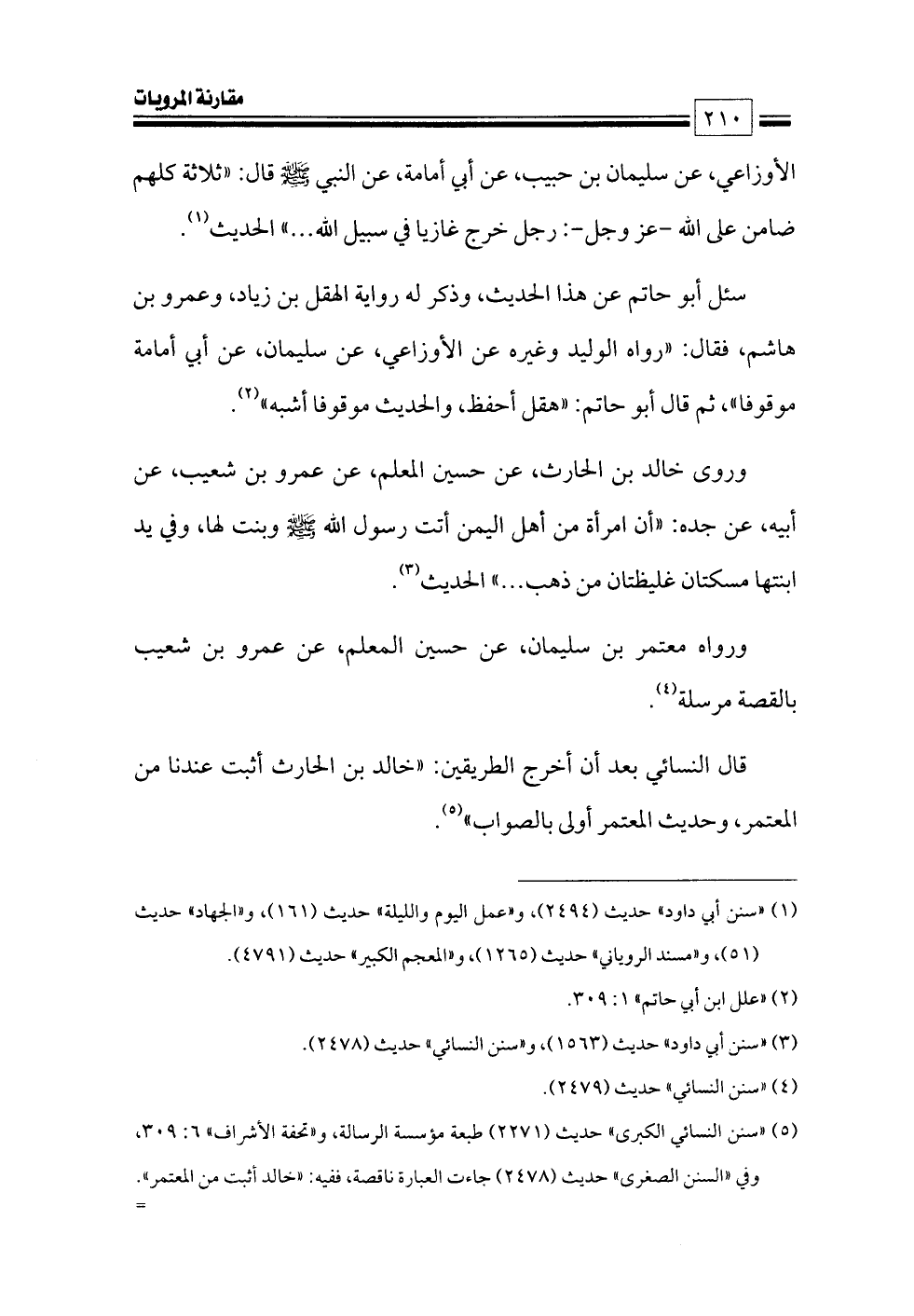 (¬٥) «سنن النسائي الكبرى» حديث (٢٢٧١) طبعة مؤسسة الرسالة، و «تحفة الأشراف» ٦: ٣٠٩، وفي «السنن الصغرى» حديث (٢٤٧٨) جاءت العبارة ناقصة، ففيه: «خالد أثبت من المعتمر». وانظر مثالا آخر للنسائي في «السنن الكبرى» حديث (٢٥٣٨) طبعة مؤسسة الرسالة، و «تحفة الأشراف» ٩: ٤٤٠.