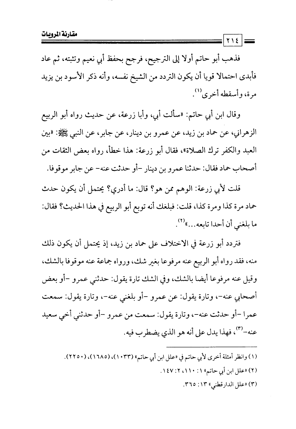 وقال ابن أبي حاتم: «سألت أبي، وأبا زرعة، عن حديث رواه أبو الربيع الزهراني، عن حماد بن زيد، عن عمرو بن دينار، عن جابر، عن النبي - صلى الله عليه وسلم -: «بين العبد والكفر ترك الصلاة»، فقال أبو زرعة: هذا خطأ, رواه بعض الثقات من أصحاب حماد فقال: حدثنا عمرو بن دينار -أو حدثت عنه- عن جابر موقوفا.