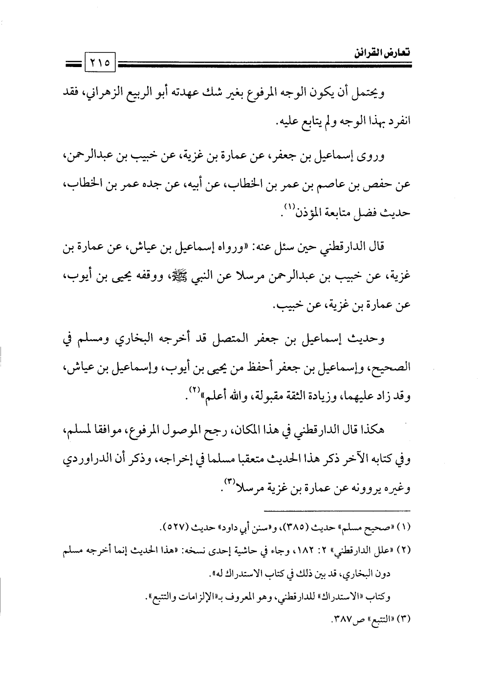 هكذا قال الدارقطني في هذا المكان، رجح الموصول المرفوع، موافقا لمسلم, وفي كتابه الآخر ذكر هذا الحديث متعقبا مسلما في إخراجه، وذكر أن الدراوردي وغيره يروونه عن عمارة بن غزية مرسلا (¬٣).