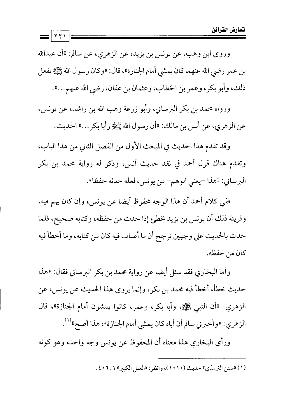 وأما البخاري فقد سئل أيضا عن رواية محمد بن بكر البرساني فقال: «هذا حديث خطأ، أخطأ فيه محمد بن بكر، وإنما يروى هذا الحديث عن يونس، عن الزهري: «أن النبي - صلى الله عليه وسلم -، وأبا بكر، وعمر، كانوا يمشون أمام الجنازة»، قال الزهري: «وأخبرني سالم أن أباه كان يمشي أمام الجنازة»، هذا أصح» (¬١).