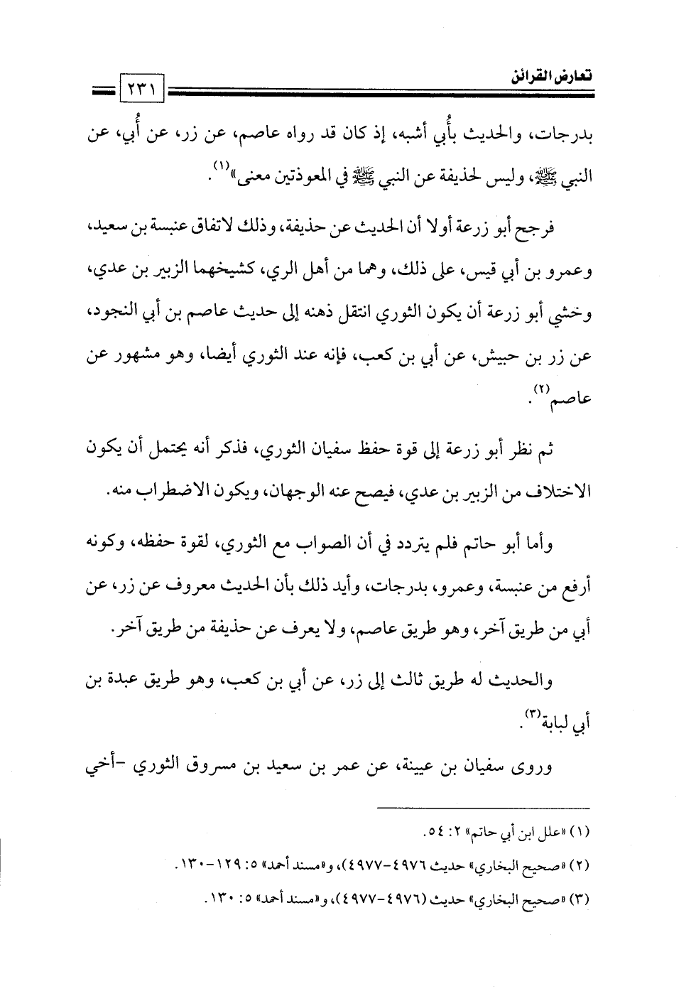 وأما أبو حاتم فلم يتردد في أن الصواب مع الثوري، لقوة حفظه، وكونه أرفع من عنبسة، وعمرو، بدرجات, وأيد ذلك بأن الحديث معروف عن زر، عن أبي من طريق آخر، وهو طريق عاصم، ولا يعرف عن حذيفة من طريق آخر.