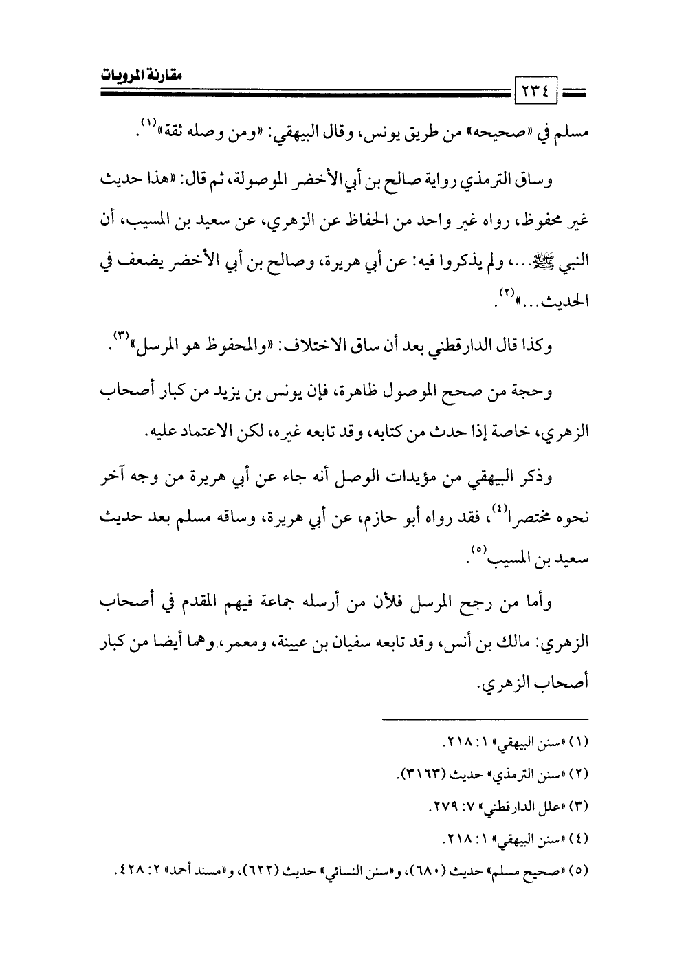 وأما من رجح المرسل فلأن من أرسله جماعة فيهم المقدم في أصحاب الزهري: مالك بن أنس، وقد تابعه سفيان بن عيينة، ومعمر، وهما أيضا من كبار أصحاب الزهري.
