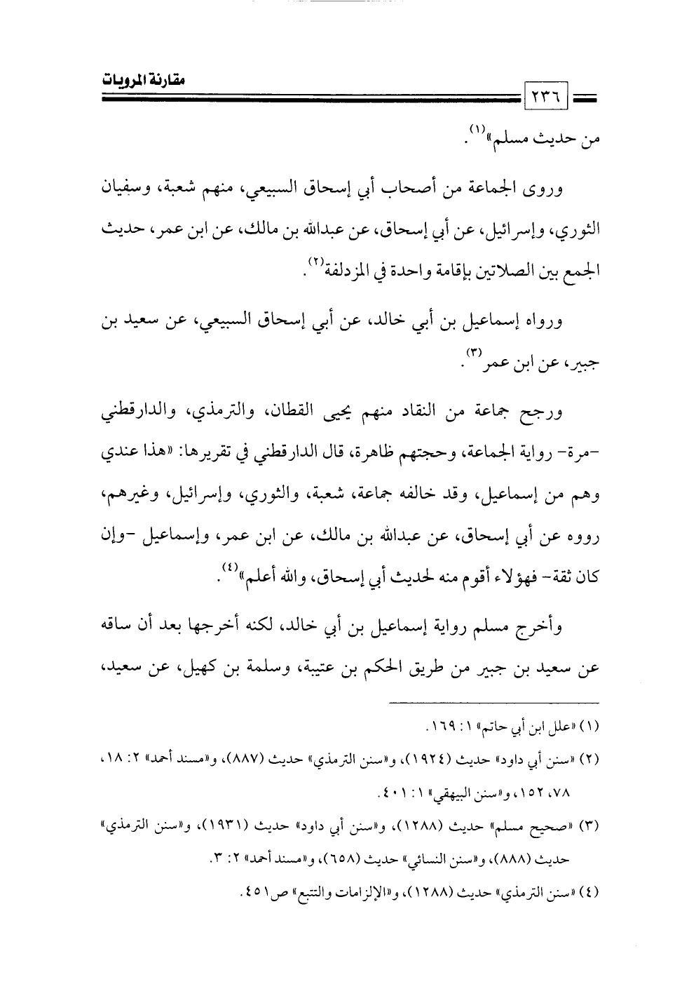 -مرة- رواية الجماعة، وحجتهم ظاهرة، قال الدارقطني في تقريرها: «هذا عندي وهم من إسماعيل، وقد خالفه جماعة، شعبة، والثوري، وإسرائيل، وغيرهم، رووه عن أبي إسحاق، عن عبدالله بن مالك، عن ابن عمر، وإسماعيل -وإن كان ثقة- فهؤلاء أقوم منه لحديث أبي إسحاق، والله أعلم» (¬٤).