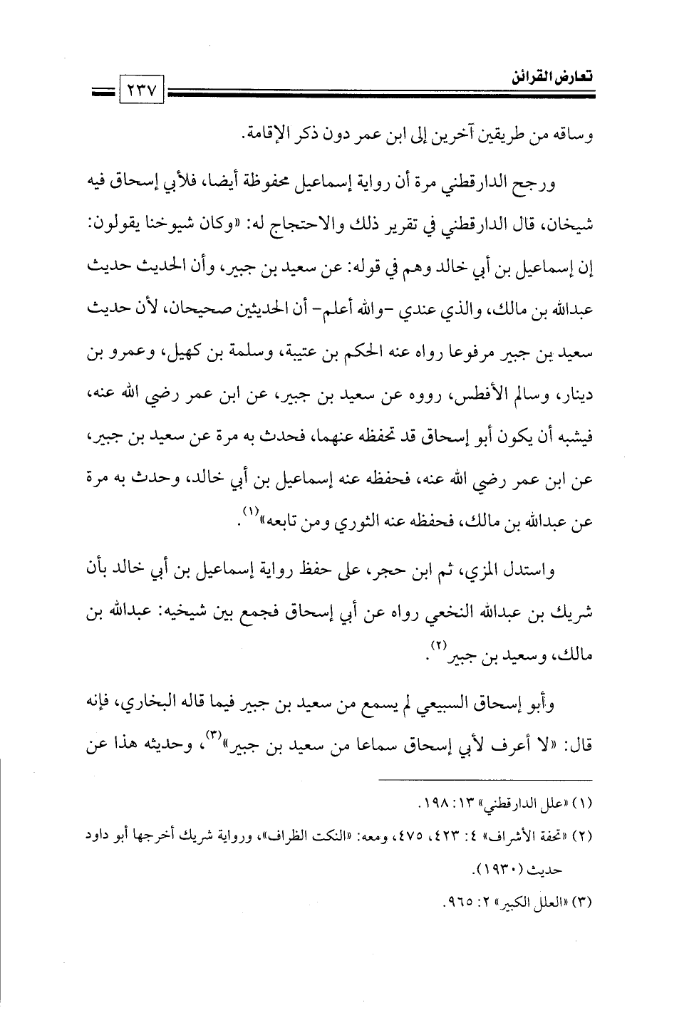 ورجح الدارقطني مرة أن رواية إسماعيل محفوظة أيضا, فلأبي إسحاق فيه شيخان، قال الدارقطني في تقرير ذلك والاحتجاج له: «وكان شيوخنا يقولون: إن إسماعيل بن أبي خالد وهم في قوله: عن سعيد بن جبير، وأن الحديث حديث عبدالله بن مالك، والذي عندي -والله أعلم- أن الحديثين صحيحان، لأن حديث سعيد بن جبير مرفوعا رواه عنه الحكم بن عتيبة، وسلمة بن كهيل، وعمرو بن دينار, وسالم الأفطس, رووه عن سعيد بن جبير, عن ابن عمر رضي الله عنه, فيشبه أن يكون أبو إسحاق قد تحفظه عنهما، فحدث به مرة عن سعيد بن جبير، عن ابن عمر رضي الله عنه، فحفظه عنه إسماعيل بن أبي خالد، وحدث به مرة عن عبدالله بن مالك, فحفظه عنه الثوري ومن تابعه» (¬١).