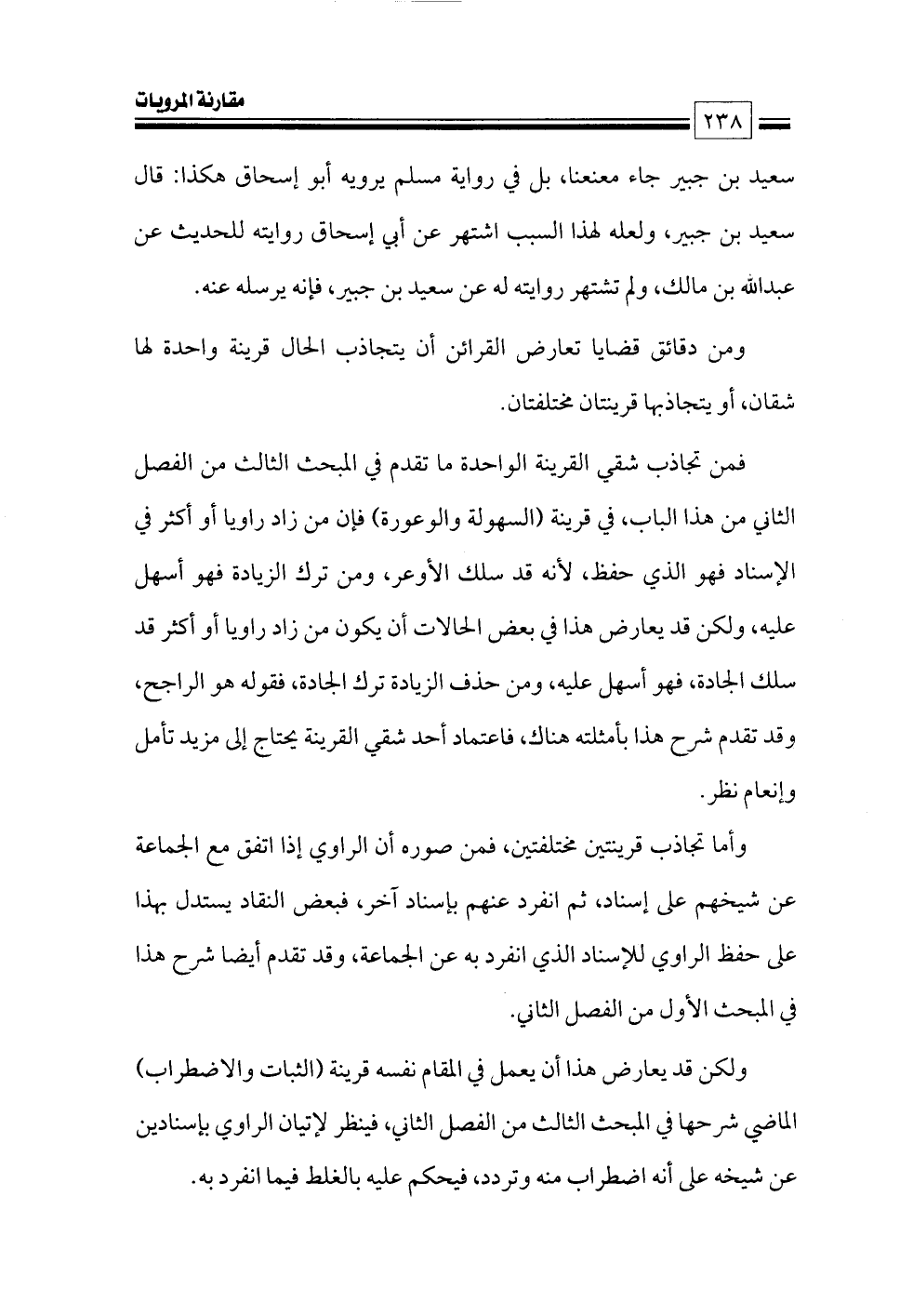 وأما تجاذب قرينتين مختلفتين، فمن صوره أن الراوي إذا اتفق مع الجماعة عن شيخهم على إسناد، ثم انفرد عنهم بإسناد آخر، فبعض النقاد يستدل بهذا على حفظ الراوي للإسناد الذي انفرد به عن الجماعة، وقد تقدم أيضا شرح هذا في المبحث الأول من الفصل الثاني.