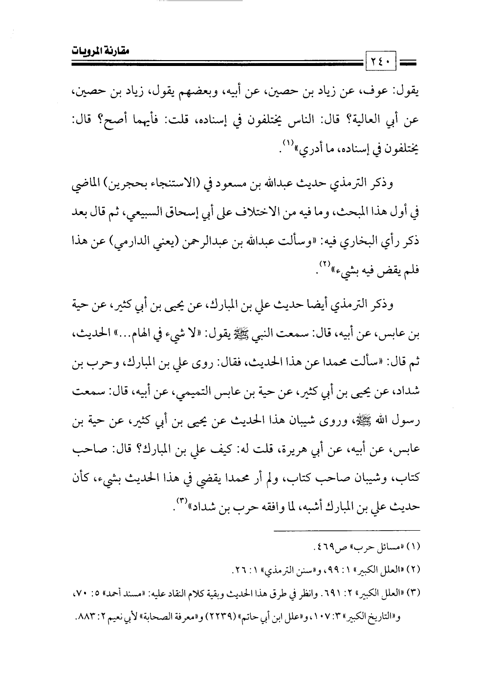 وذكر الترمذي أيضا حديث علي بن المبارك, عن يحيى بن أبي كثير, عن حية بن عابس, عن أبيه, قال: سمعت النبي - صلى الله عليه وسلم - يقول: «لا شيء في الهام ... » الحديث, ثم قال: «سألت محمدا عن هذا الحديث, فقال: روى علي بن المبارك, وحرب بن شداد, عن يحيى بن أبي كثير, عن حية بن عابس التميمي, عن أبيه, قال: سمعت رسول الله - صلى الله عليه وسلم -، وروى شيبان هذا الحديث عن يحيى بن أبي كثير، عن حية بن عابس، عن أبيه، عن أبي هريرة, قلت له: كيف علي بن المبارك؟ قال: صاحب كتاب, وشيبان صاحب كتاب, ولم أر محمدا يقضي في هذا الحديث بشيء, كأن حديث علي بن المبارك أشبه, لما وافقه حرب بن شداد» (¬٣).