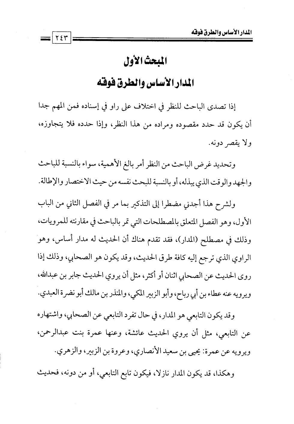 ولشرح هذا أجدني مضطرا إلى التذكير بما مر في الفصل الثاني من الباب الأول, وهو الفصل المتعلق بالمصطلحات التي تمر بالباحث في مقارنته للمرويات، وذلك في مصطلح (المدار)، فقد تقدم هناك أن الحديث له مدار أساس، وهو الراوي الذي ترجع إليه كافة طرق الحديث، وقد يكون هو الصحابي، وذلك إذا روى الحديث عن الصحابي اثنان أو أكثر، مثل أن يروي الحديث جابر بن عبدالله، ويرويه عنه عطاء بن أبي رباح، وأبو الزبير المكي، والمنذر بن مالك أبو نضرة العبدي.