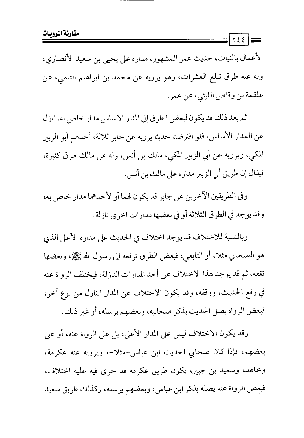 وبالنسبة للاختلاف قد يوجد اختلاف في الحديث على مداره الأعلى الذي هو الصحابي مثلا، أو التابعي، فبعض الطرق ترفعه إلى رسول الله - صلى الله عليه وسلم -، وبعضها تقفه، ثم قد يوجد هذا الاختلاف على أحد المدارات النازلة، فيختلف الرواة عنه في رفع الحديث، ووقفه، وقد يكون الاختلاف عن المدار النازل من نوع آخر، فبعض الرواة يصل الحديث بذكر صحابيه، وبعضهم يرسله، أو غير ذلك.