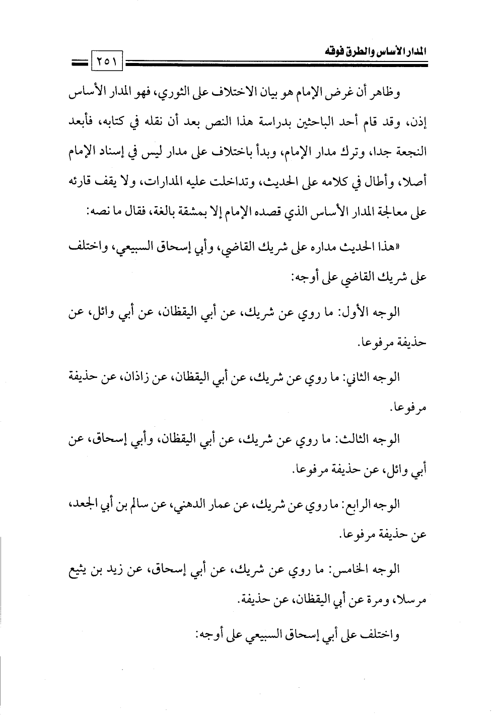 وظاهر أن غرض الإمام هو بيان الاختلاف على الثوري، فهو المدار الأساس إذن، وقد قام أحد الباحثين بدراسة هذا النص بعد أن نقله في كتابه، فأبعد النجعة جدا، وترك مدار الإمام، وبدأ باختلاف على مدار ليس في إسناد الإمام أصلا، وأطال في كلامه على الحديث، وتداخلت عليه المدارات، ولا يقف قارئه على معالجة المدار الأساس الذي قصده الإمام إلا بمشقة بالغة، فقال ما نصه: