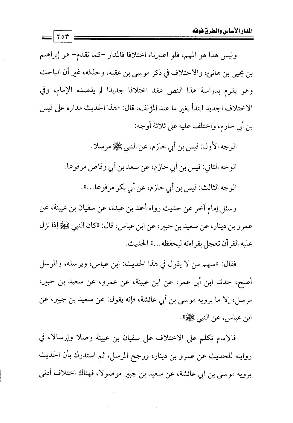 وليس هذا هو المهم، فلو اعتبرناه اختلافا فالمدار -كما تقدم- هو إبراهيم بن يحيى بن هانئ, والاختلاف في ذكر موسى بن عقبة، وحذفه، غير أن الباحث وهو يقوم بدراسة هذا النص عقد اختلافا جديدا لم يقصده الإمام، وفي الاختلاف الجديد ابتدأ بغير ما عند المؤلف، قال: «هذا الحديث مداره على قيس بن أبي حازم، واختلف عليه على ثلاثة أوجه: