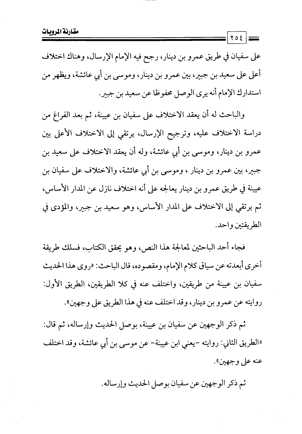 والباحث له أن يعقد الاختلاف على سفيان بن عيينة، ثم بعد الفراغ من دراسة الاختلاف عليه، وترجيح الإرسال، يرتقي إلى الاختلاف الأعلى بين عمرو بن دينار، وموسى بن أبي عائشة, وله أن يعقد الاختلاف على سعيد بن جبير, بين عمرو بن دينار , وموسى بن أبي عائشة, والاختلاف على سفيان بن عيينة في طريق عمرو بن دينار يعالجه على أنه اختلاف نازل عن المدار الأساس, ثم يرتقي إلى الاختلاف على المدار الأساس، وهو سعيد بن جبير, والمؤدى في الطريقتين واحد.