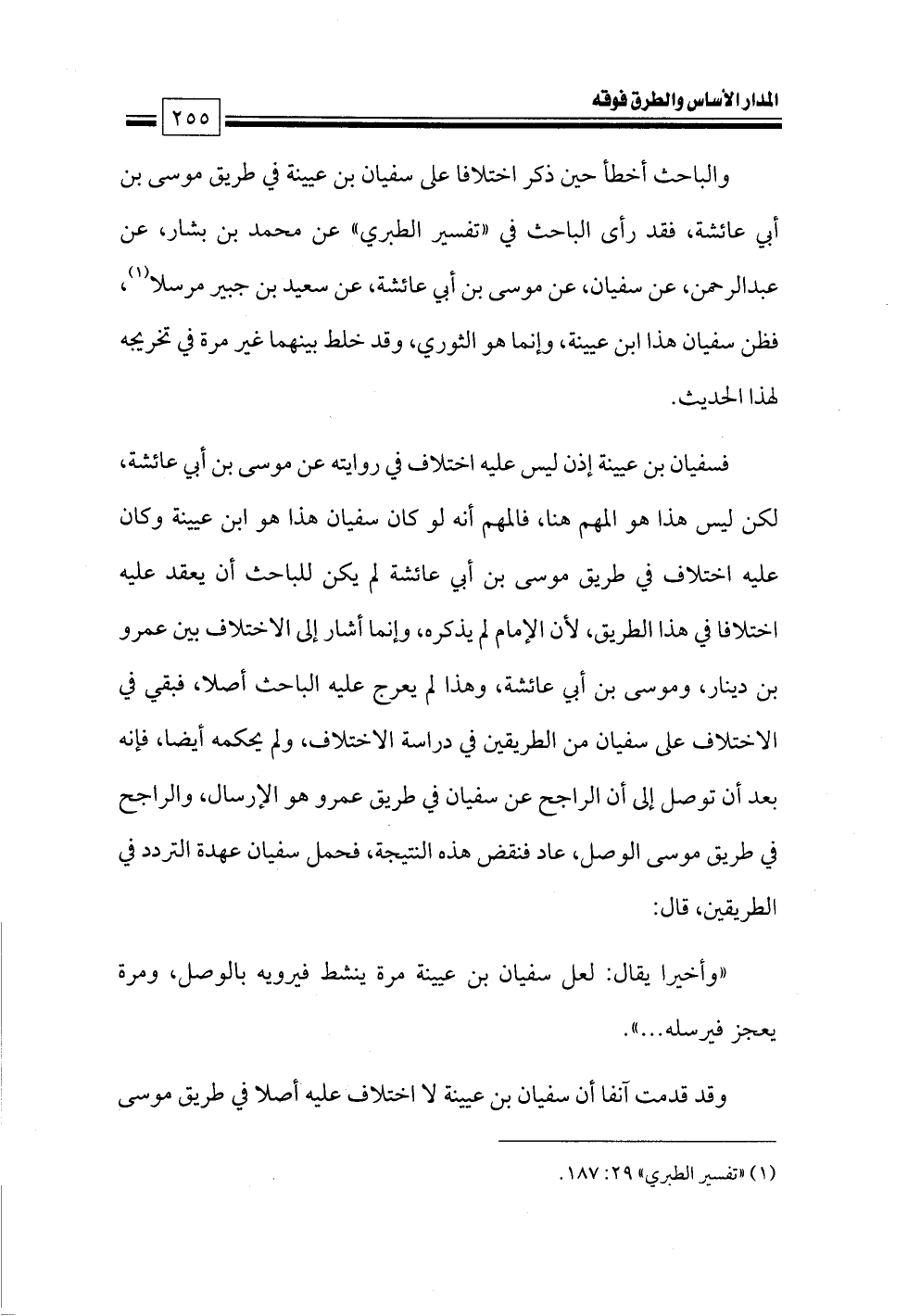 فسفيان بن عيينة إذن ليس عليه اختلاف في روايته عن موسى بن أبي عائشة، لكن ليس هذا هو المهم هنا، فالمهم أنه لو كان سفيان هذا هو ابن عيينة وكان عليه اختلاف في طريق موسى بن أبي عائشة لم يكن للباحث أن يعقد عليه اختلافا في هذا الطريق، لأن الإمام لم يذكره، وإنما أشار إلى الاختلاف بين عمرو بن دينار، وموسى بن أبي عائشة، وهذا لم يعرج عليه الباحث أصلا، فبقي في الاختلاف على سفيان من الطريقين في دراسة الاختلاف، ولم يحكمه أيضا، فإنه بعد أن توصل إلى أن الراجح عن سفيان في طريق عمرو هو الإرسال، والراجح في طريق موسى الوصل، عاد فنقض هذه النتيجة، فحمل سفيان عهدة التردد في الطريقين، قال: