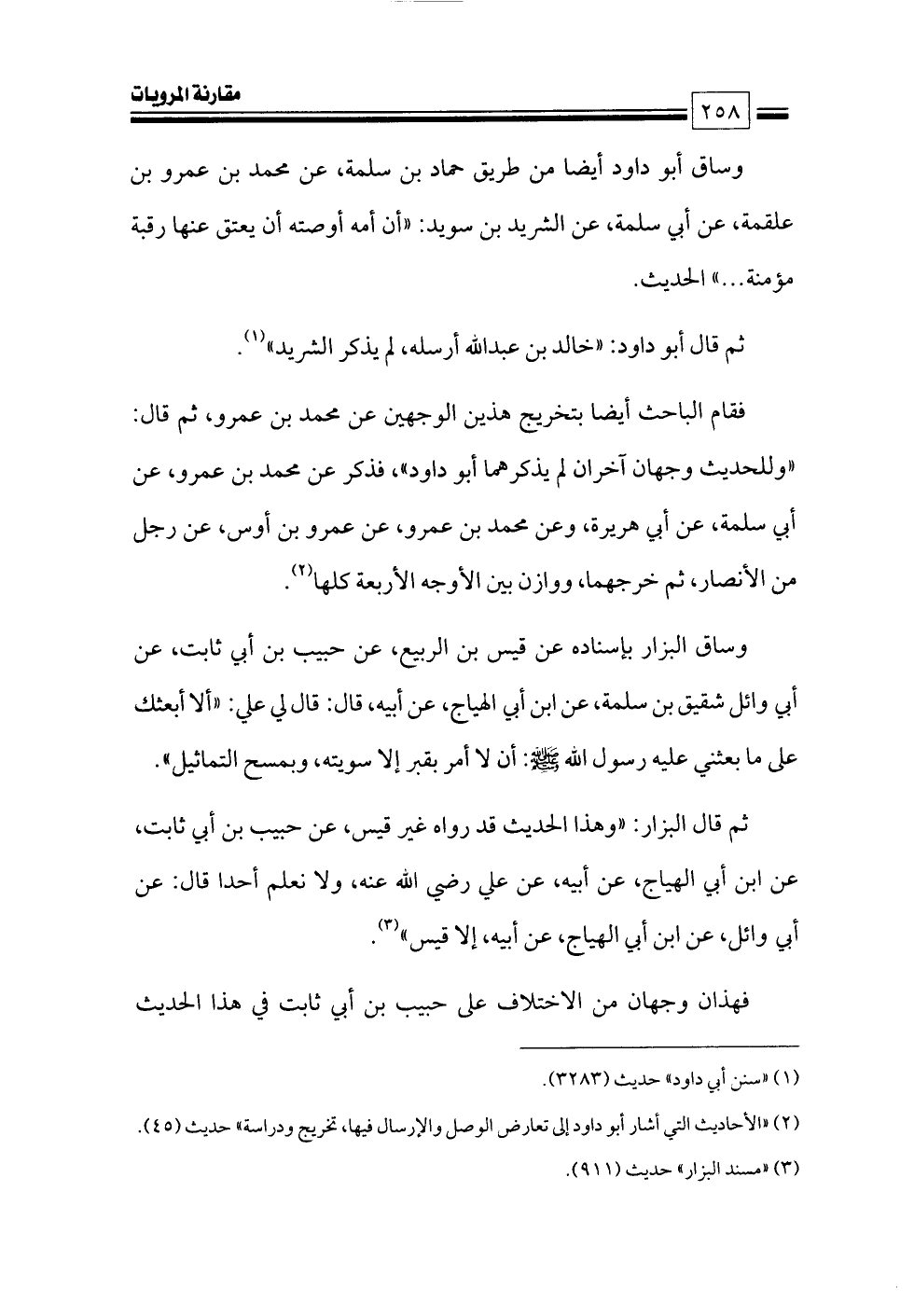 فقام الباحث أيضا بتخريج هذين الوجهين عن محمد بن عمرو، ثم قال: «وللحديث وجهان آخران لم يذكرهما أبو داود»، فذكر عن محمد بن عمرو، عن أبي سلمة، عن أبي هريرة، وعن محمد بن عمرو، عن عمرو بن أوس، عن رجل من الأنصار، ثم خرجهما، ووازن بين الأوجه الأربعة كلها (¬٢).