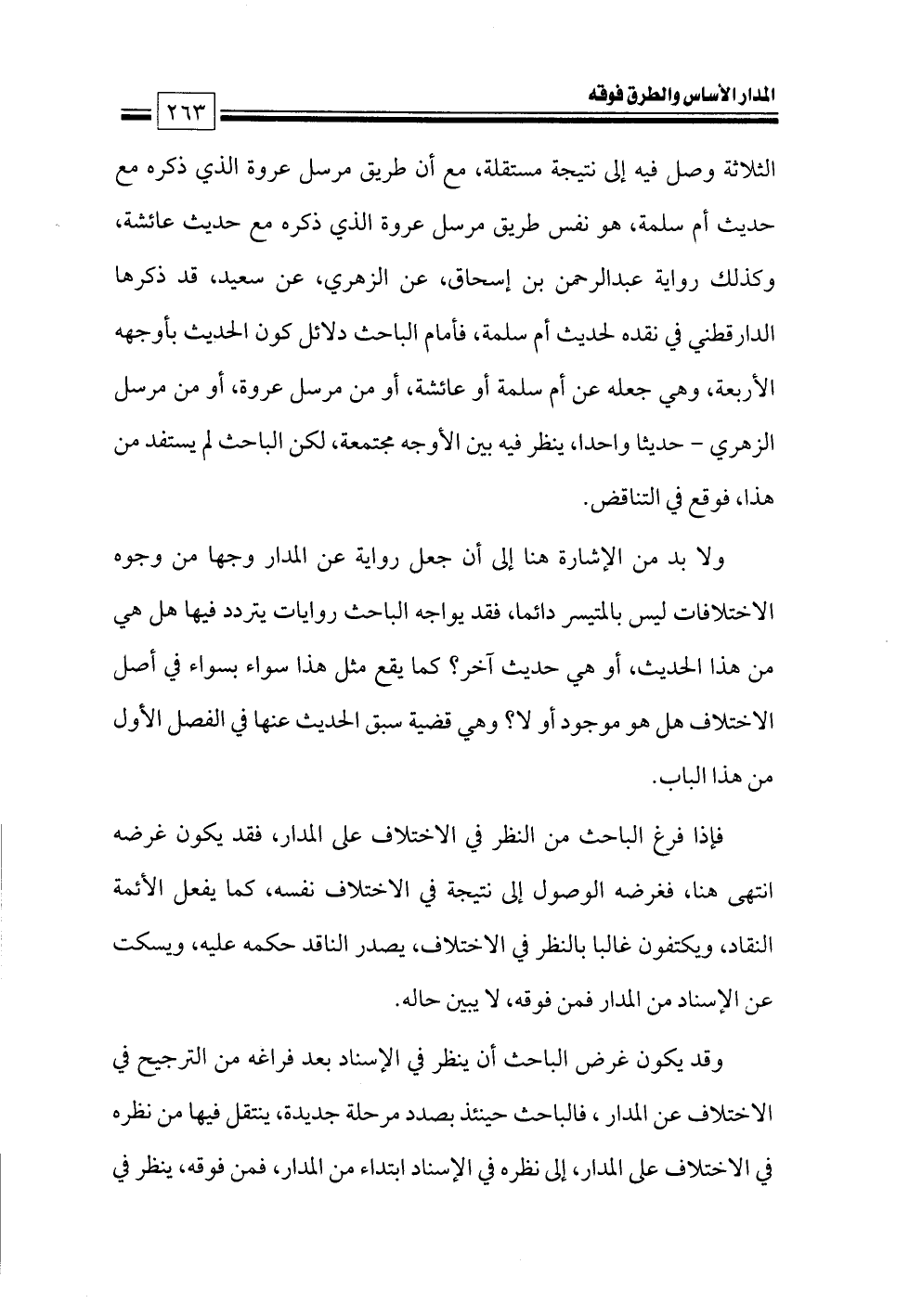 الثلاثة وصل فيه إلى نتيجة مستقلة، مع أن طريق مرسل عروة الذي ذكره مع حديث أم سلمة، هو نفس طريق مرسل عروة الذي ذكره مع حديث عائشة، وكذلك رواية عبدالرحمن بن إسحاق، عن الزهري، عن سعيد، قد ذكرها الدارقطني في نقده لحديث أم سلمة، فأمام الباحث دلائل كون الحديث بأوجهه الأربعة, وهي جعله عن أم سلمة أو عائشة، أو من مرسل عروة، أو من مرسل الزهري - حديثا واحدا، ينظر فيه بين الأوجه مجتمعة، لكن الباحث لم يستفد من هذا، فوقع في التناقض.