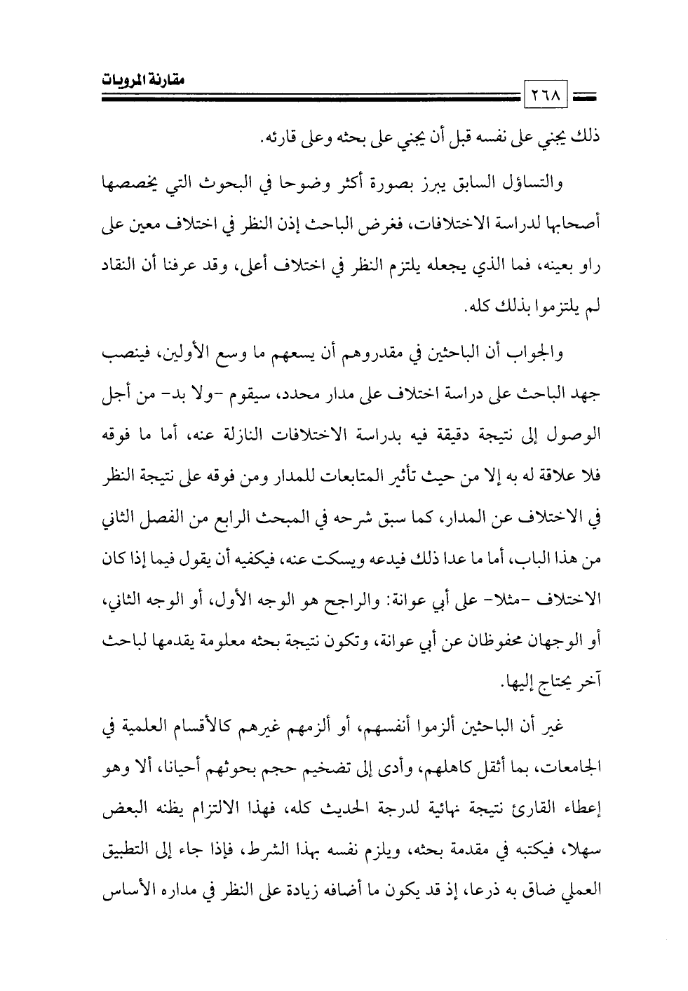 والجواب أن الباحثين في مقدروهم أن يسعهم ما وسع الأولين، فينصب جهد الباحث على دراسة اختلاف على مدار محدد، سيقوم -ولا بد- من أجل الوصول إلى نتيجة دقيقة فيه بدراسة الاختلافات النازلة عنه, أما ما فوقه فلا علاقة له به إلا من حيث تأثير المتابعات للمدار ومن فوقه على نتيجة النظر في الاختلاف عن المدار، كما سبق شرحه في المبحث الرابع من الفصل الثاني من هذا الباب، أما ما عدا ذلك فيدعه ويسكت عنه، فيكفيه أن يقول فيما إذا كان الاختلاف -مثلا- على أبي عوانة: والراجح هو الوجه الأول، أو الوجه الثاني، أو الوجهان محفوظان عن أبي عوانة، وتكون نتيجة بحثه معلومة يقدمها لباحث آخر يحتاج إليها.
