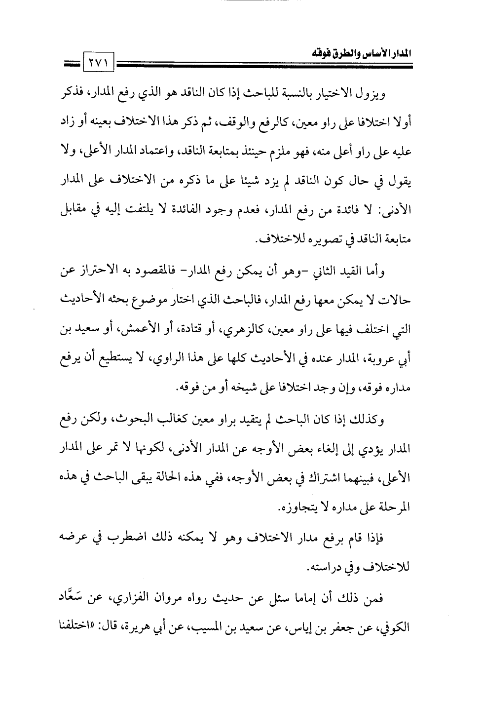 وأما القيد الثاني -وهو أن يمكن رفع المدار- فالمقصود به الاحتراز عن حالات لا يمكن معها رفع المدار، فالباحث الذي اختار موضوع بحثه الأحاديث التي اختلف فيها على راو معين، كالزهري، أو قتادة، أو الأعمش، أو سعيد بن أبي عروبة، المدار عنده في الأحاديث كلها على هذا الراوي، لا يستطيع أن يرفع مداره فوقه، وإن وجد اختلافا على شيخه أو من فوقه.