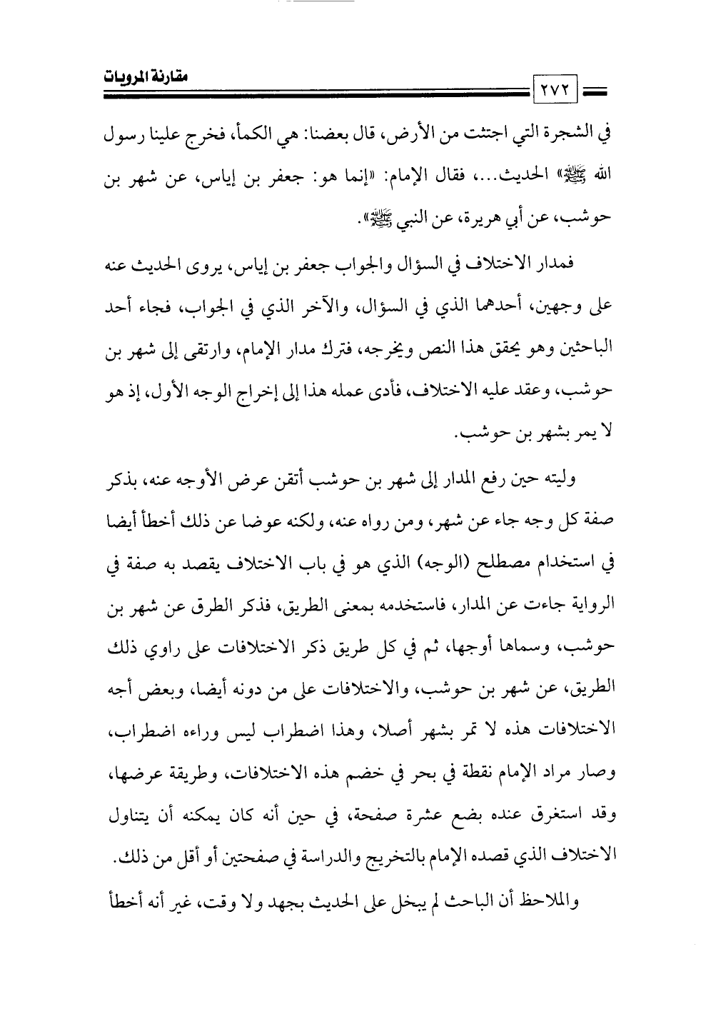 فمدار الاختلاف في السؤال والجواب جعفر بن إياس، يروى الحديث عنه على وجهين، أحدهما الذي في السؤال، والآخر الذي في الجواب، فجاء أحد الباحثين وهو يحقق هذا النص ويخرجه، فترك مدار الإمام، وارتقى إلى شهر بن حوشب، وعقد عليه الاختلاف، فأدى عمله هذا إلى إخراج الوجه الأول، إذ هو لا يمر بشهر بن حوشب.