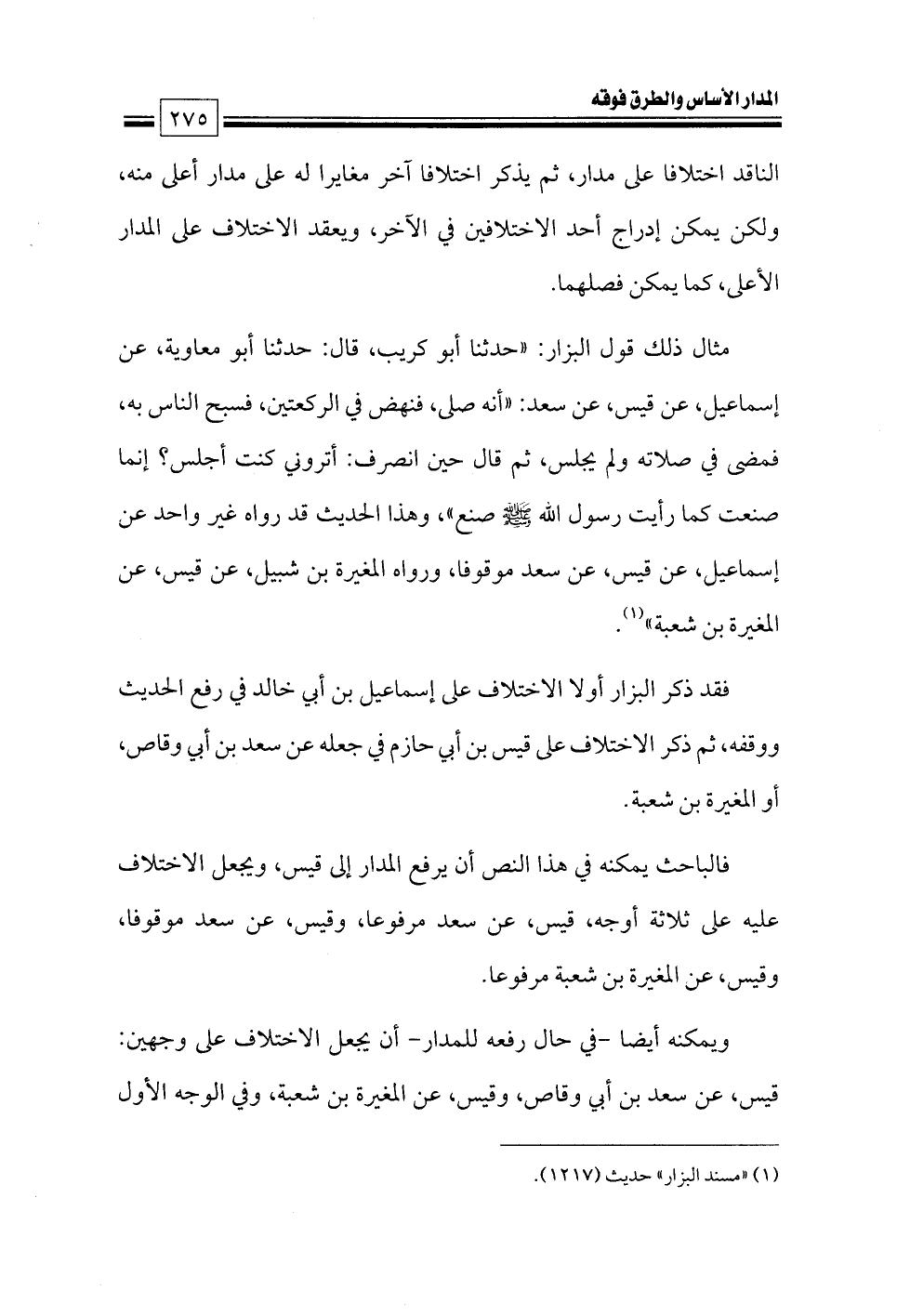 فالباحث يمكنه في هذا النص أن يرفع المدار إلى قيس، ويجعل الاختلاف عليه على ثلاثة أوجه، قيس، عن سعد مرفوعا، وقيس، عن سعد موقوفا، وقيس، عن المغيرة بن شعبة مرفوعا.
