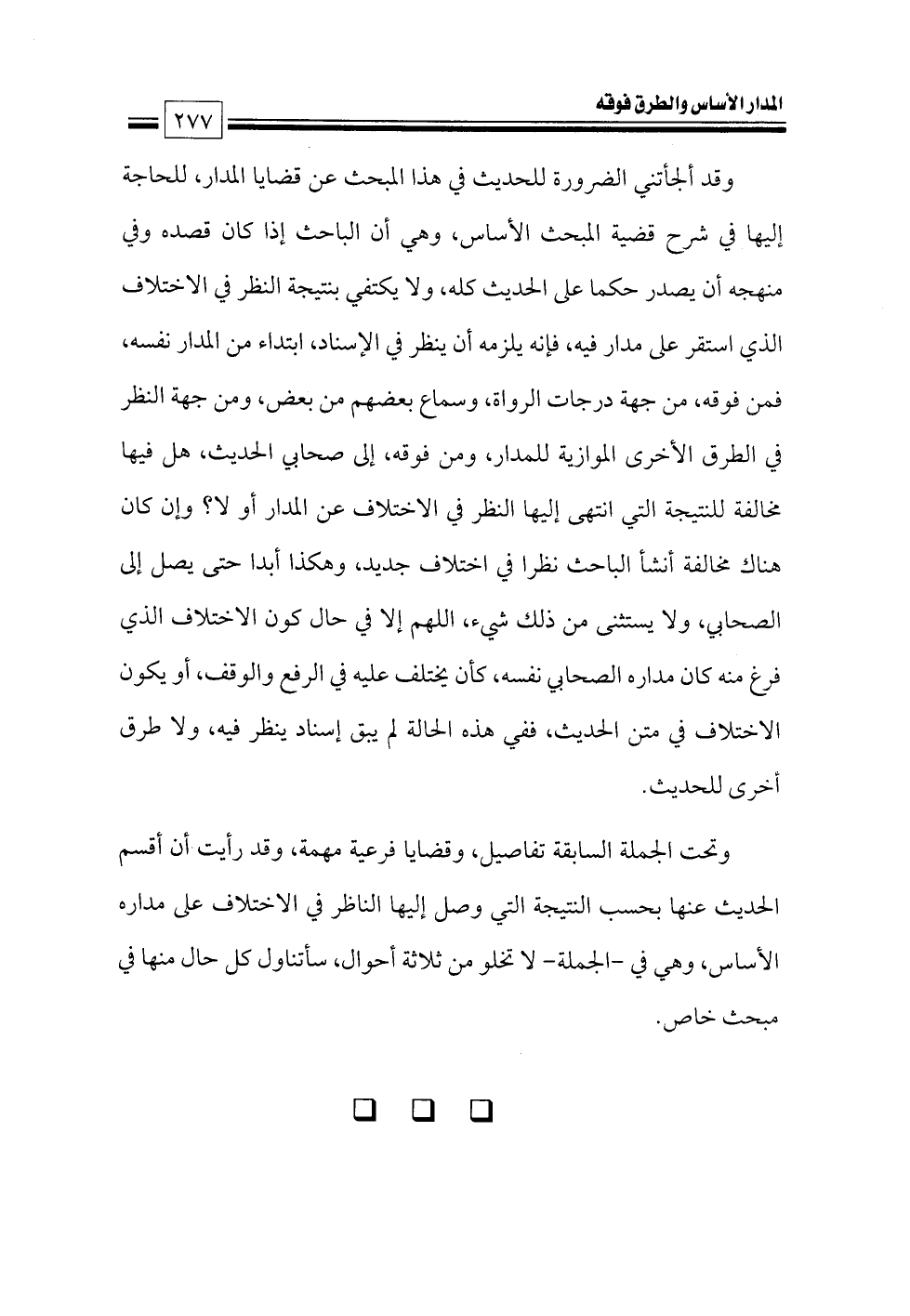 وقد ألجأتني الضرورة للحديث في هذا المبحث عن قضايا المدار, للحاجة إليها في شرح قضية المبحث الأساس, وهي أن الباحث إذا كان قصده وفي منهجه أن يصدر حكما على الحديث كله، ولا يكتفي بنتيجة النظر في الاختلاف الذي استقر على مدار فيه، فإنه يلزمه أن ينظر في الإسناد، ابتداء من المدار نفسه، فمن فوقه، من جهة درجات الرواة، وسماع بعضهم من بعض، ومن جهة النظر في الطرق الأخرى الموازية للمدار، ومن فوقه، إلى صحابي الحديث، هل فيها مخالفة للنتيجة التي انتهى إليها النظر في الاختلاف عن المدار أو لا؟ وإن كان هناك مخالفة أنشأ الباحث نظرا في اختلاف جديد، وهكذا أبدا حتى يصل إلى الصحابي، ولا يستثنى من ذلك شيء، اللهم إلا في حال كون الاختلاف الذي فرغ منه كان مداره الصحابي نفسه، كأن يختلف عليه في الرفع والوقف، أو يكون الاختلاف في متن الحديث، ففي هذه الحالة لم يبق إسناد ينظر فيه، ولا طرق أخرى للحديث.