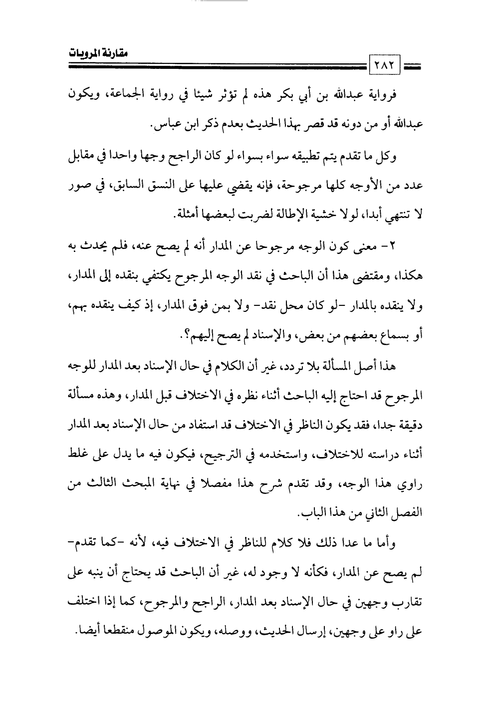 ٢ - معنى كون الوجه مرجوحا عن المدار أنه لم يصح عنه، فلم يحدث به هكذا، ومقتضى هذا أن الباحث في نقد الوجه المرجوح يكتفي بنقده إلى المدار، ولا ينقده بالمدار -لو كان محل نقد- ولا بمن فوق المدار، إذ كيف ينقده بهم، أو بسماع بعضهم من بعض، والإسناد لم يصح إليهم؟ .