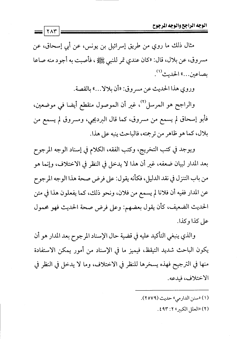 والراجح هو المرسل (¬٢) , غير أن الموصول منقطع أيضا في موضعين, فأبو إسحاق لم يسمع من مسروق, كما قال البرديجي, ومسروق لم يسمع من بلال, كما هو ظاهر من ترجمته, فالباحث ينبه على هذا.