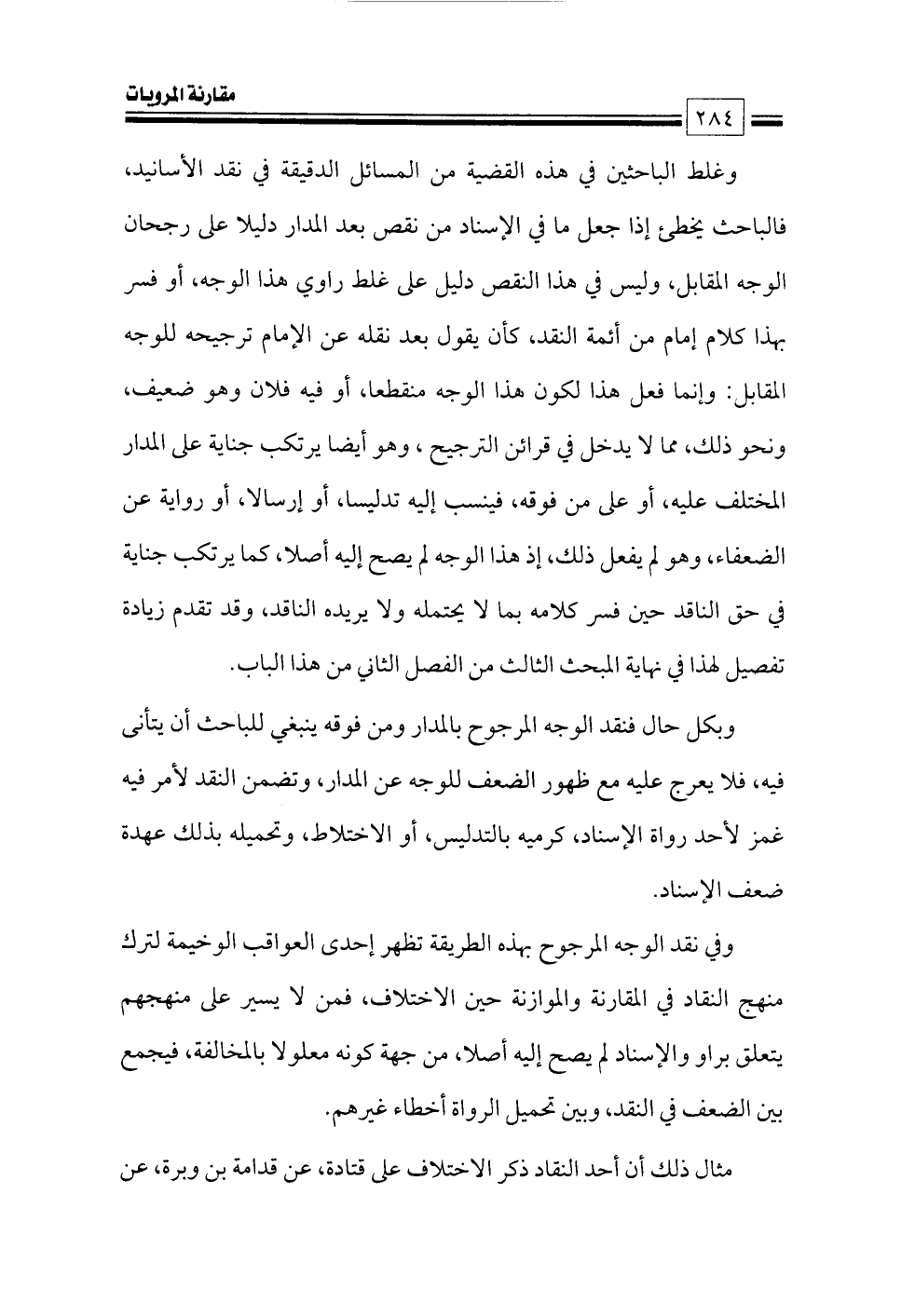 وبكل حال فنقد الوجه المرجوح بالمدار ومن فوقه ينبغي للباحث أن يتأنى فيه، فلا يعرج عليه مع ظهور الضعف للوجه عن المدار، وتضمن النقد لأمر فيه غمز لأحد رواة الإسناد، كرميه بالتدليس، أو الاختلاط، وتحميله بذلك عهدة ضعف الإسناد.