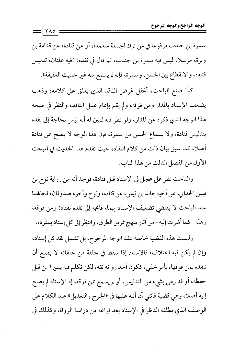 وليست هذه القضية خاصة بنقد الوجه المرجوح، بل تشمل نقد كل إسناد، وإن لم يكن فيه اختلاف، فالإسناد إذا سقط في حلقة من حلقاته لا يصح أن ننقده بمن فوقها، بأمر خفي، ككون أحد رواته ثقة، لكن تكلم فيه يسيرا من قبل حفظه، أو قد رمي بشيء من التدليس، أو لم يسمع ممن فوقه، إذ الإسناد لم يصح إليه أصلا، وهي قضية فاتني أن أنبه عليها في «الجرح والتعديل» عند الكلام على الوصف الذي يطلقه الناظر في الإسناد بعد فراغه من دراسة الرواة، وكذلك في