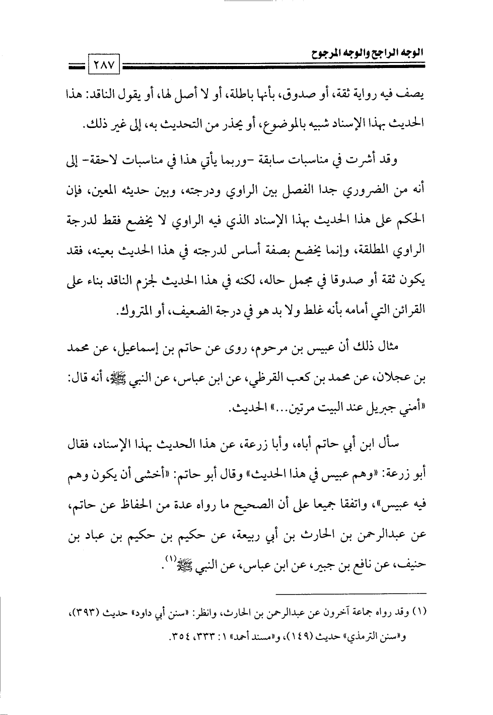سأل ابن أبي حاتم أباه، وأبا زرعة، عن هذا الحديث بهذا الإسناد، فقال أبو زرعة: «وهم عبيس في هذا الحديث» وقال أبو حاتم: «أخشى أن يكون وهم فيه عبيس»، واتفقا جميعا على أن الصحيح ما رواه عدة من الحفاظ عن حاتم, عن عبدالرحمن بن الحارث بن أبي ربيعة, عن حكيم بن حكيم بن عباد بن حنيف, عن نافع بن جبير, عن ابن عباس, عن النبي - صلى الله عليه وسلم - (¬١).
