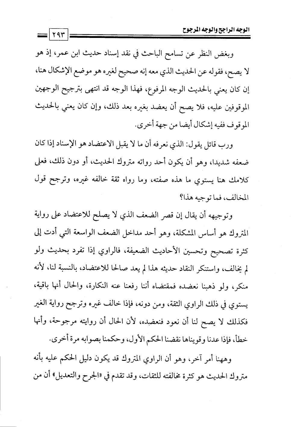 وتوجيهه أن يقال إن قصر الضعف الذي لا يصلح للاعتضاد على رواية المتروك هو أساس المشكلة، وهو أحد مداخل الضعف الواسعة التي أدت إلى كثرة تصحيح وتحسين الأحاديث الضعيفة، فالراوي إذا تفرد بحديث ولو لم يخالف، واستنكر النقاد حديثه هذا لم يعد صالحا للاعتضاد، بالنسبة لنا، لأنه منكر، ولو ذهبنا نعضده فمقتضاه أننا رفعنا عنه النكارة، والحال أنها باقية، يستوي في ذلك الراوي الثقة، ومن دونه، فإذا خالف غيره وترجح رواية الغير فكذلك لا يصح لنا أن نعود فنعضده، لأن الحال أن روايته مرجوحة، وأنها خطأ، فإذا عدنا وقويناها نقضنا الحكم الأول, وحكمنا بصوابه مرة أخرى.