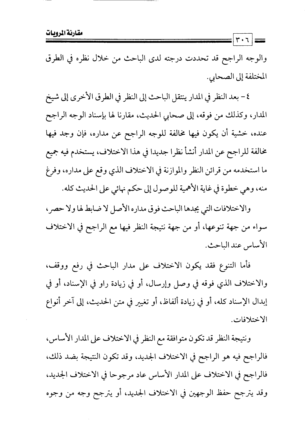 ٤ - بعد النظر في المدار ينتقل الباحث إلى النظر في الطرق الأخرى إلى شيخ المدار، وكذلك من فوقه، إلى صحابي الحديث، مقارنا لها بإسناد الوجه الراجح عنده, خشية أن يكون فيها مخالفة للوجه الراجح عن مداره, فإن وجد فيها مخالفة للراجح عن المدار أنشأ نظرا جديدا في هذا الاختلاف، يستخدم فيه جميع ما استخدمه من قرائن النظر والموازنة في الاختلاف الذي وقع على مداره، وفرغ منه، وهي خطوة في غاية الأهمية للوصول إلى حكم نهائي على الحديث كله.
