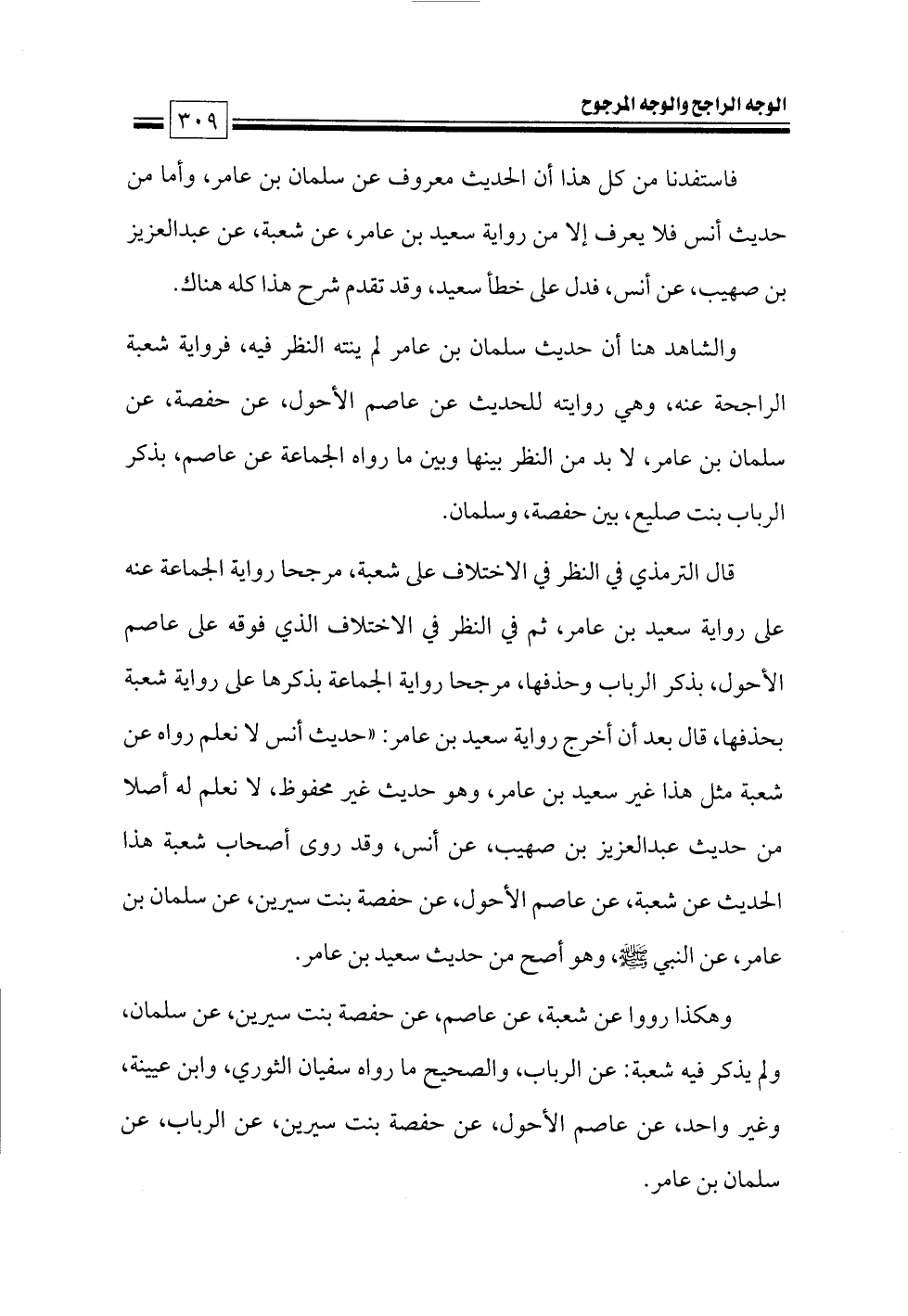 قال الترمذي في النظر في الاختلاف على شعبة، مرجحا رواية الجماعة عنه على رواية سعيد بن عامر، ثم في النظر في الاختلاف الذي فوقه على عاصم الأحول، بذكر الرباب وحذفها، مرجحا رواية الجماعة بذكرها على رواية شعبة بحذفها، قال بعد أن أخرج رواية سعيد بن عامر: «حديث أنس لا نعلم رواه عن شعبة مثل هذا غير سعيد بن عامر، وهو حديث غير محفوظ, لا نعلم له أصلا من حديث عبدالعزيز بن صهيب، عن أنس، وقد روى أصحاب شعبة هذا الحديث عن شعبة، عن عاصم الأحول، عن حفصة بنت سيرين، عن سلمان بن عامر، عن النبي - صلى الله عليه وسلم -، وهو أصح من حديث سعيد بن عامر.