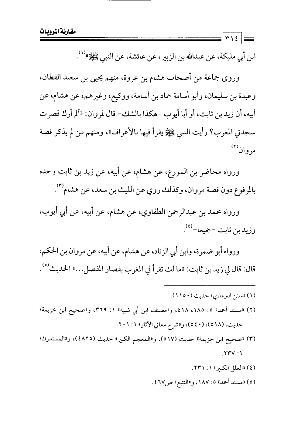 وروى جماعة من أصحاب هشام بن عروة، منهم يحيى بن سعيد القطان، وعبدة بن سليمان، وأبو أسامة حماد بن أسامة، ووكيع، وغيرهم، عن هشام، عن أبيه، أن زيد بن ثابت، أو أبا أيوب -هكذا بالشك- قال لمروان: «ألم أرك قصرت سجدتي المغرب؟ رأيت النبي - صلى الله عليه وسلم - يقرأ فيها بالأعراف»، ومنهم من لم يذكر قصة مروان (¬٢).