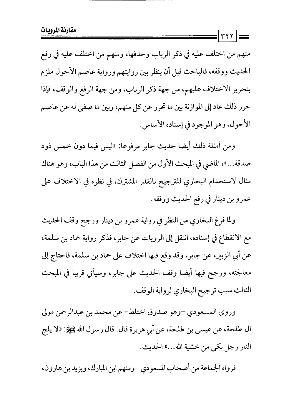 ومن أمثلة ذلك أيضا حديث جابر مرفوعا: «ليس فيما دون خمس ذود صدقة ... »، الماضي في المبحث الأول من الفصل الثالث من هذا الباب، وهو هناك مثال لاستخدام البخاري للترجيح بالقدر المشترك, في نظره في الاختلاف على عمرو بن دينار في رفع الحديث ووقفه.