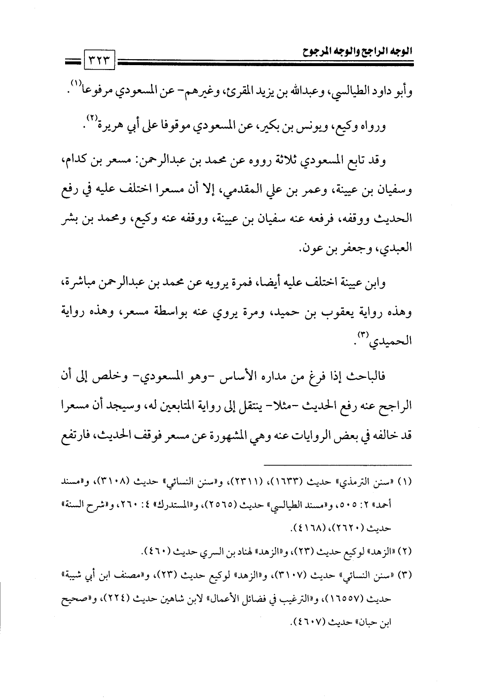 فالباحث إذا فرغ من مداره الأساس -وهو المسعودي- وخلص إلى أن الراجح عنه رفع الحديث -مثلا- ينتقل إلى رواية المتابعين له، وسيجد أن مسعرا قد خالفه في بعض الروايات عنه وهي المشهورة عن مسعر فوقف الحديث، فارتفع